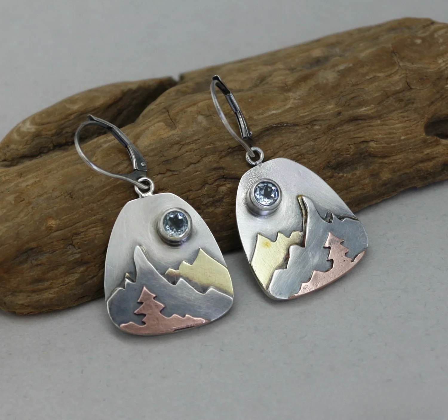 Imagine elevating your style effortlessly with this pair of vintage-inspired earrings that perfectly blend rustic charm with refined elegance. Crafted from silver-colored zinc alloy, these earrings feature a round, slightly convex shape adorned with a geometric mountain landscape design. Some peaks are highlighted with a subtle gold-tone finish, creating a layered, multi-tone visual effect. At the center, a small, faceted blue stone adds a sparkling touch, catching light beautifully with every movement. Their simple yet eye-catching design makes them suitable for various occasions, from casual daily wear to glamorous parties, engagements, weddings, or anniversaries. These versatile earrings are comfortable, elegant, and designed to speak to your unique style.