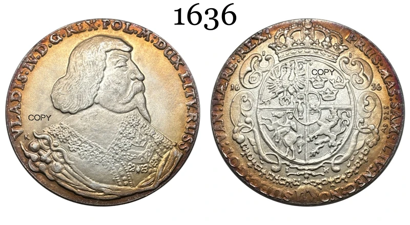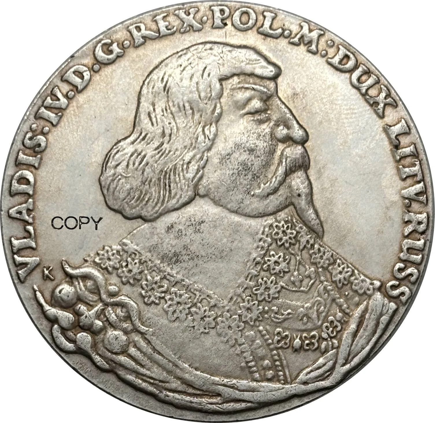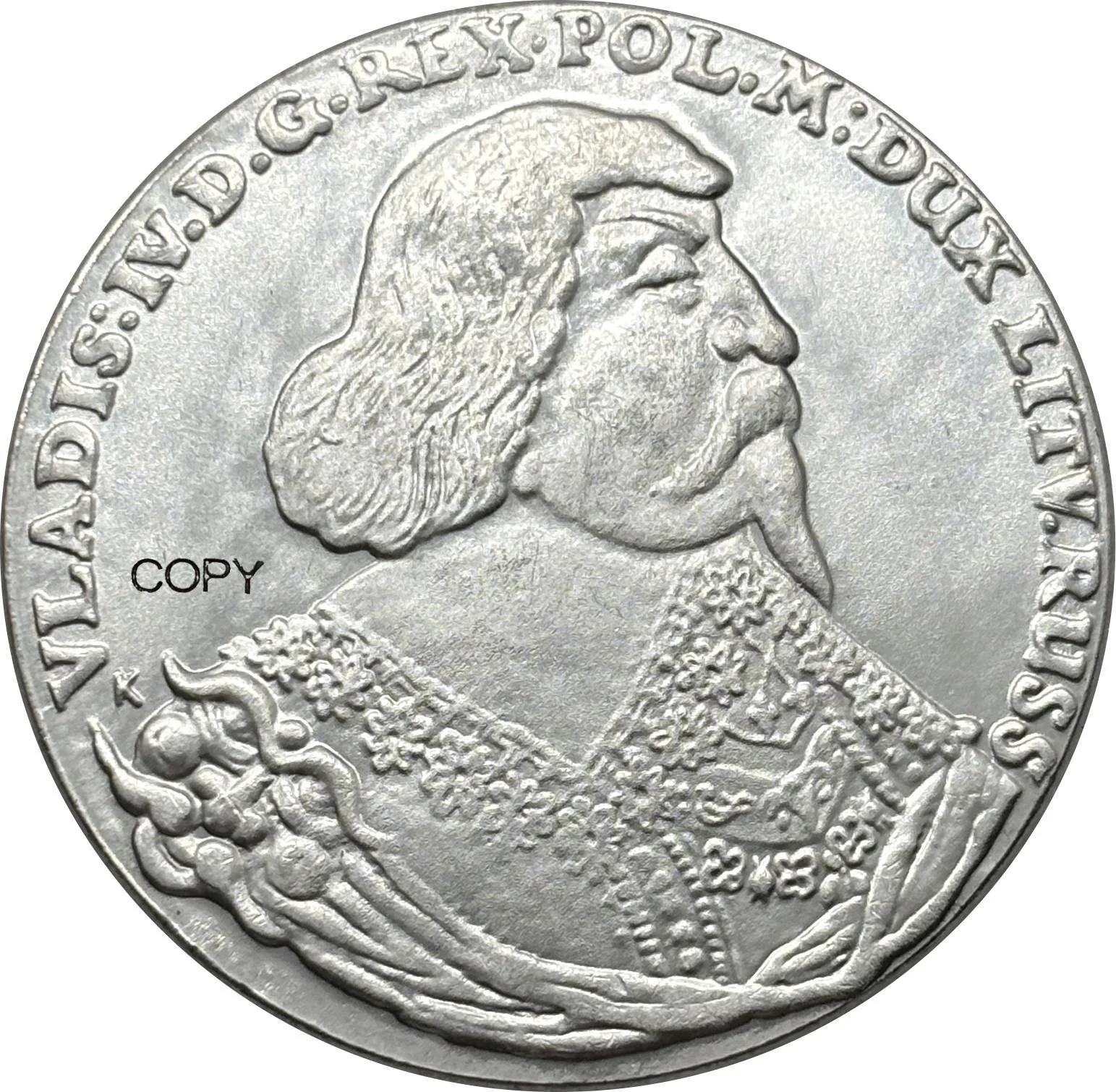 Experience the timeless charm of this highly detailed silver-plated replica coin, expertly crafted for collectors who appreciate vintage aesthetics. Featuring a weathered, antique finish, this coin vividly captures the essence of 1840 or earlier with intricate relief work. You'll notice the profile portrait of a distinguished figure, with flowing, shoulder-length hair, a prominent beard and mustache, dressed in ornate clothing decorated with lace and patterns. The coin is designed with a darkened patina that enhances its historic look. The uppercase inscription around the edge lends a regal, classic appeal. Whether displayed as part of a collection or used as a conversation piece, this high-quality replica brings history to life with authenticity and craftsmanship.