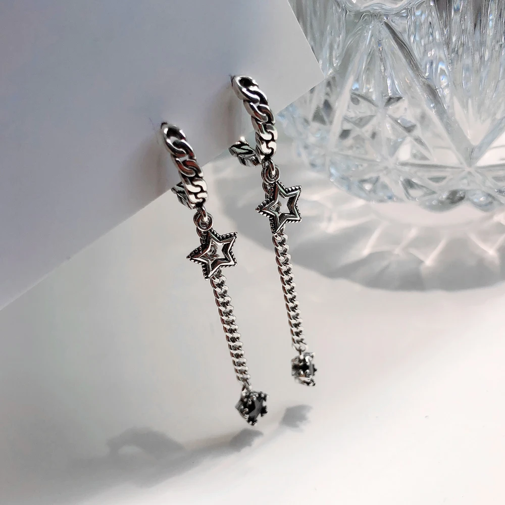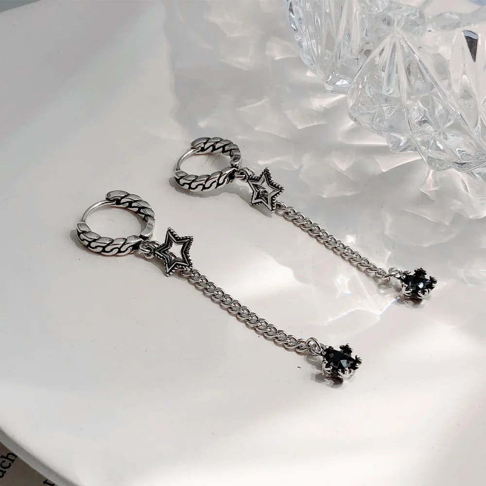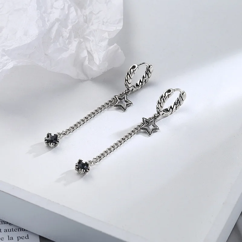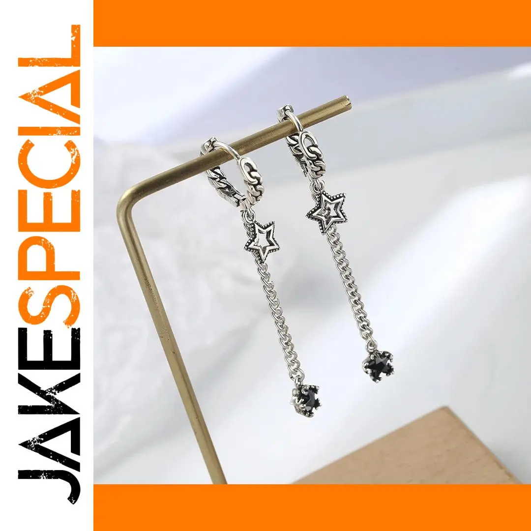 Discover these exquisite vintage-inspired earrings designed to elevate your style for special moments. Crafted from high-quality 925 sterling silver with a sleek platinum finish, each piece boasts a delicate and feminine aesthetic. The earrings feature a charming five-pointed star motif, outlined with ornate borders that evoke an antique, vintage allure. Dangling from the star are fine silver chains that sway gracefully, adding movement and elegance. At the bottom, a sparkling faceted zircon stone is set in a prong setting, contrasted by the subtle crystal side stones, delivering a touch of sophistication. Perfect for anniversaries, engagements, parties, or as a unique gift, these lightweight earrings weigh around 2 grams in total. They combine durability with refined beauty, making every occasion special.