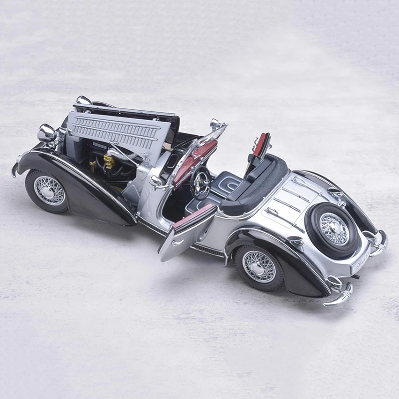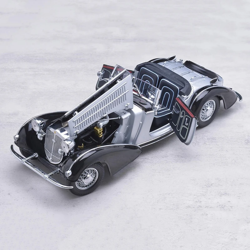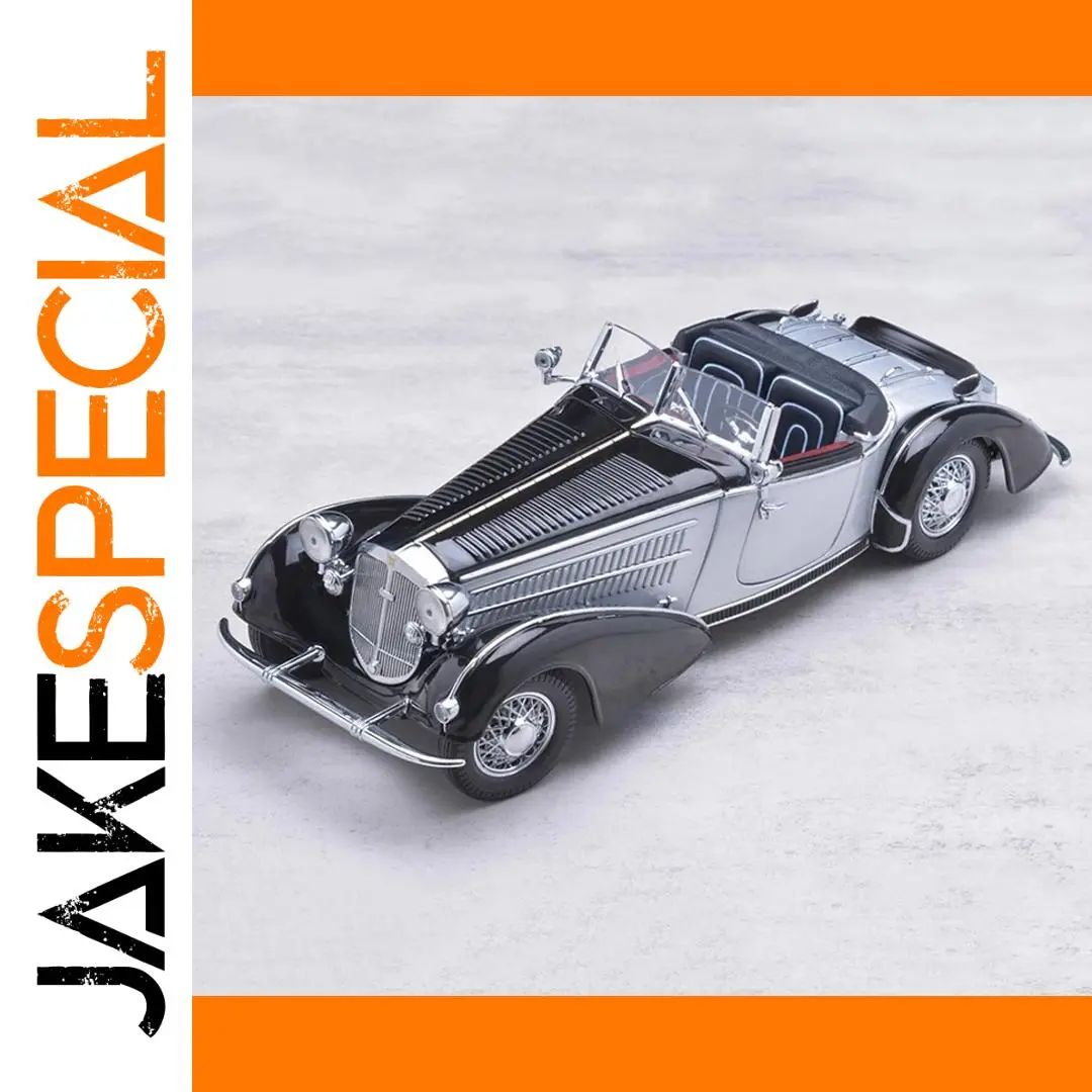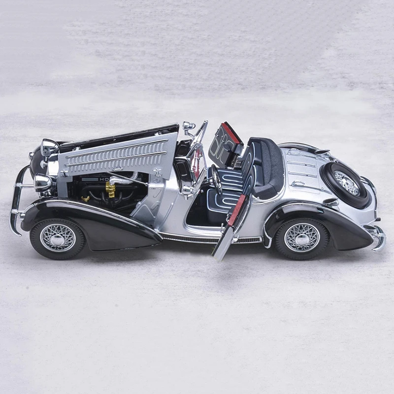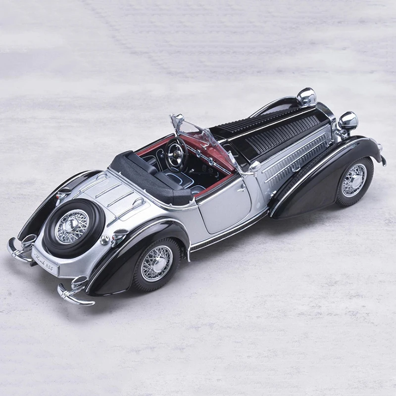 Experience vintage elegance with this highly detailed 1:18 scale Sun Star HORCH 855 model from 1939 in a sleek silver finish. Crafted with alloy body and chassis, the model features openable doors and engine hood, carefully designed vents, and realistic rubber tires with silver-spoked wheels. Measuring approximately 28.5 cm long, 10 cm wide, and 8 cm tall, and weighing 1.2 kg, it showcases authentic flowing lines, rounded fenders, and a finely detailed vertical grille. The front wheel steering with linkage steering wheel adds functional realism, making it a perfect collector’s piece for enthusiasts aged 14 and above.