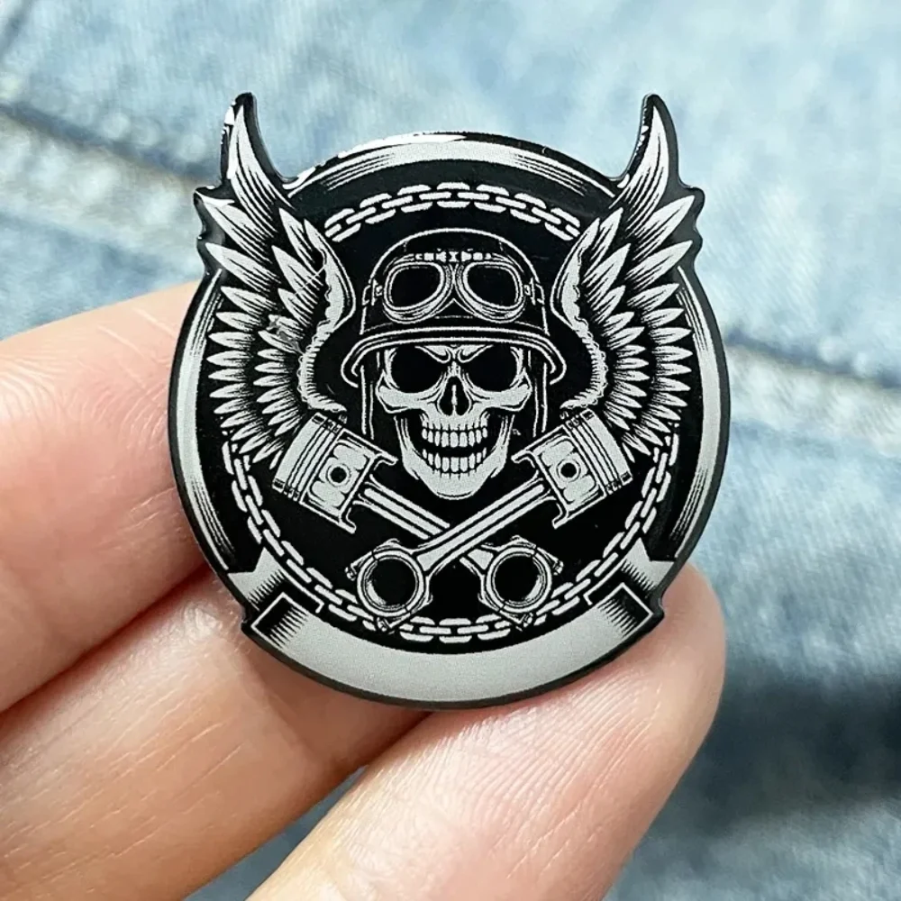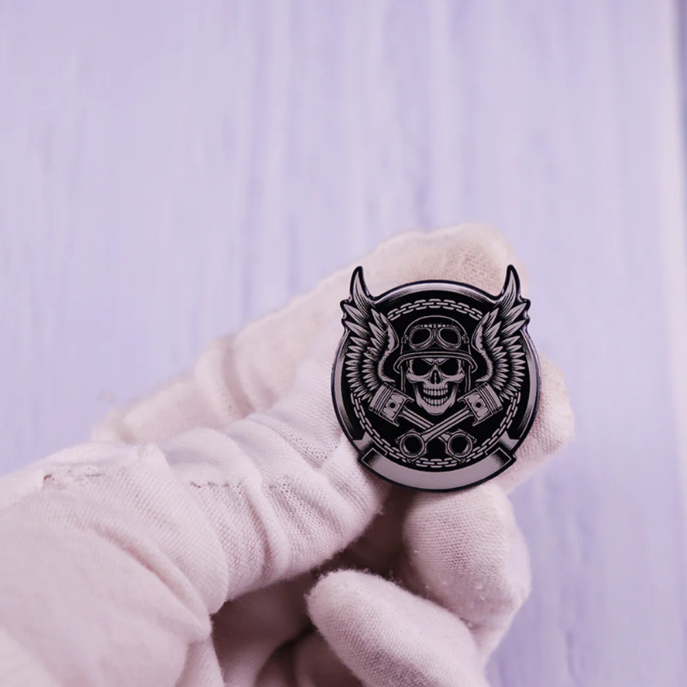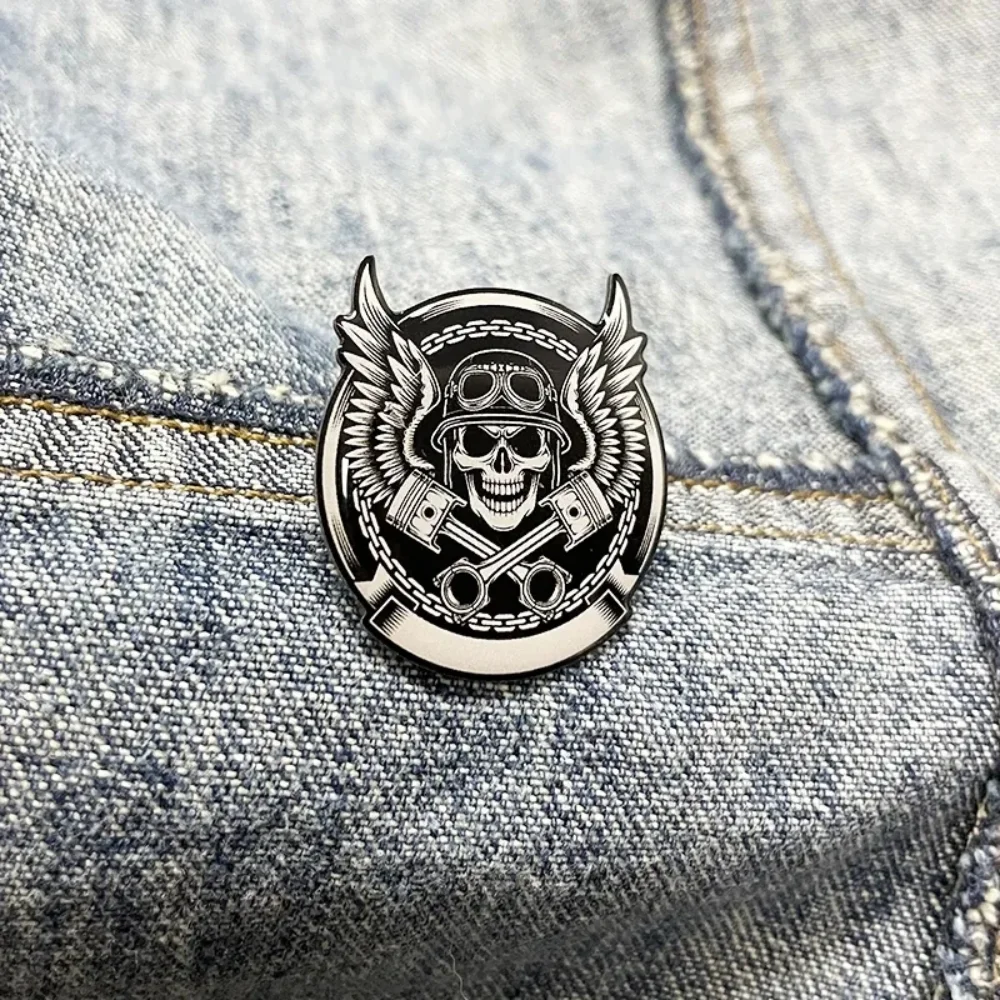 This lapel pin is an essential addition to any motorcycle enthusiast's collection or those who appreciate alternative fashion styles. Its robust construction and striking design make it a standout piece, ready to elevate your outfit. Don’t miss the chance to express your unique style with this captivating accessory!