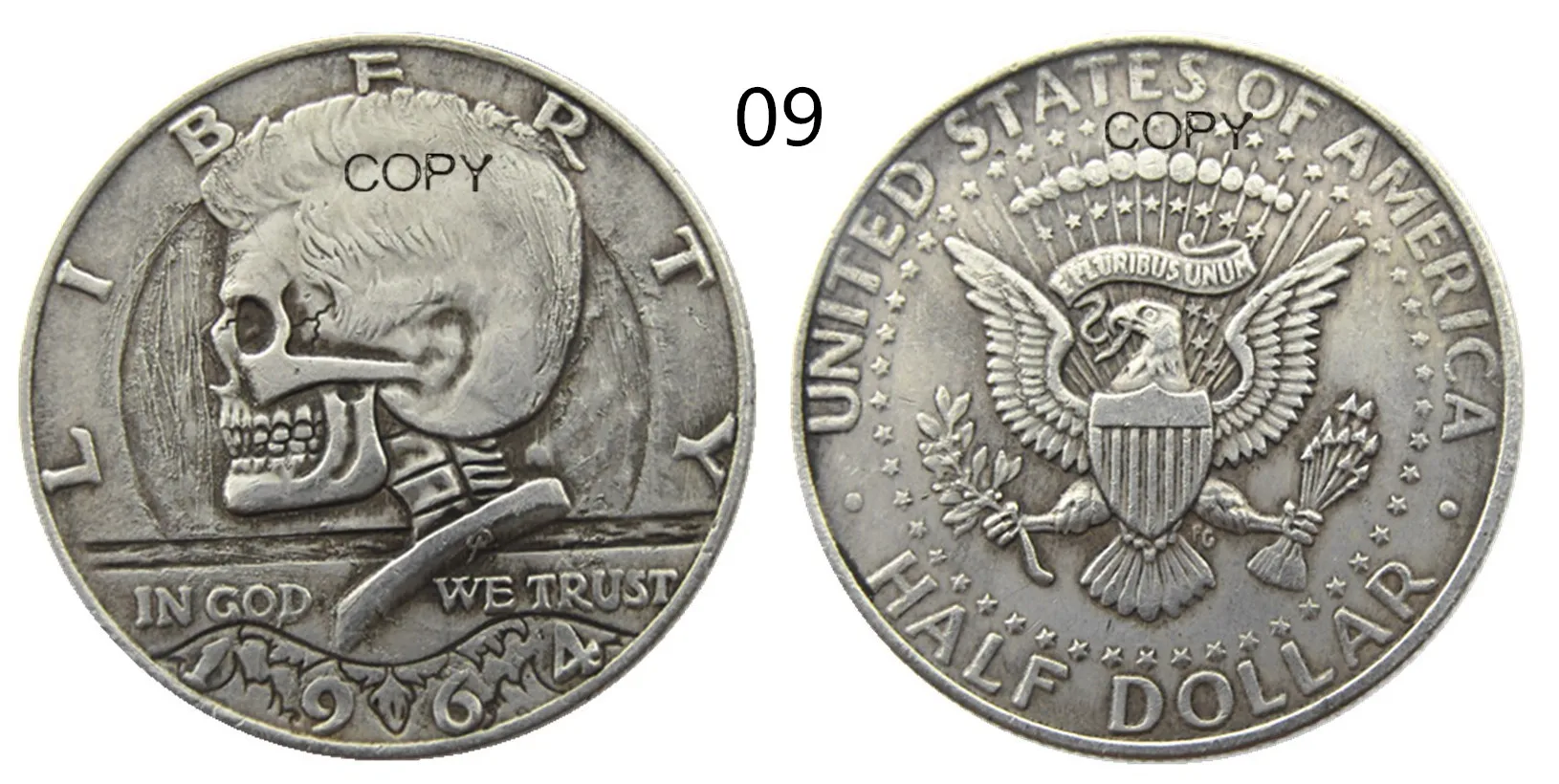 Experience a piece of history with this vintage-inspired metal coin replica, meticulously crafted to evoke the early 20th century. Its antique finish lends a nostalgic, aged look that enhances its collectible charm. The coin features a detailed carved skull in profile facing left, accentuated by zombie or skeleton hand motifs that add a rebellious, gothic touch. Surrounding the top edge are worn-looking inscriptions of “LIBERTY” and the bottom-year “1964”, along with “IN GOD WE TRUST” and decorative laurel elements, blending patriotism with dark aesthetics. Its size makes it ideal for display, jewelry, or collectors who appreciate vintage, gothic, or patriotic themes. This piece perfectly combines history, artistry, and edgy design for a unique collector's item or statement accessory.
