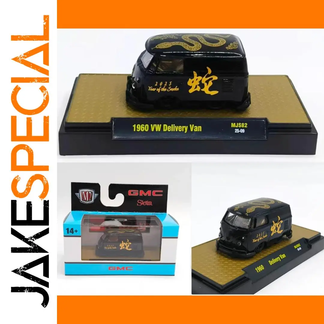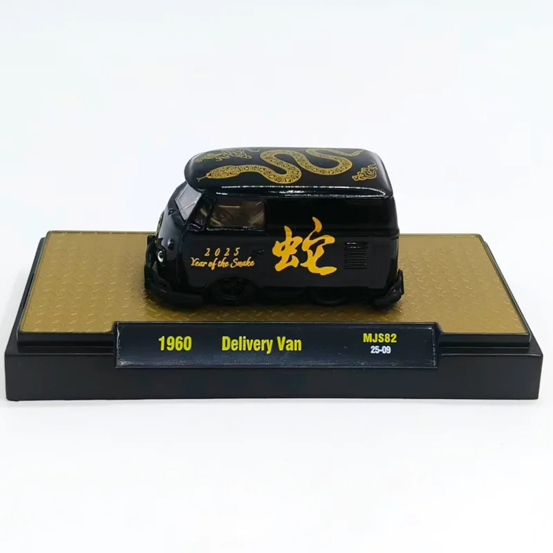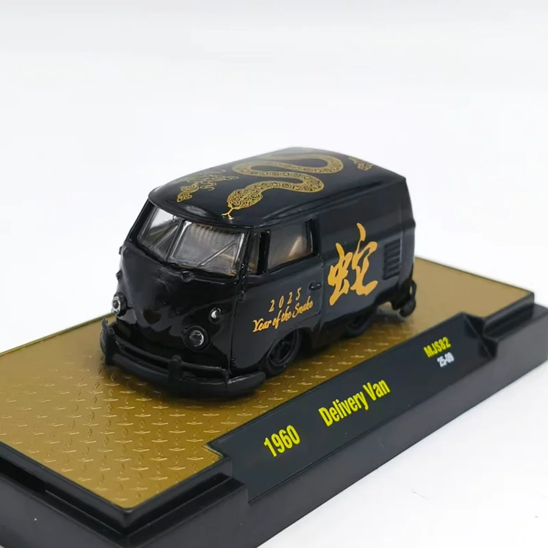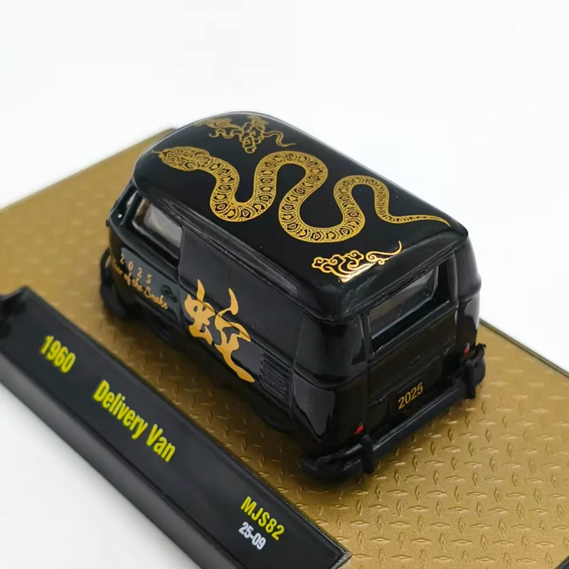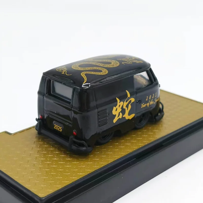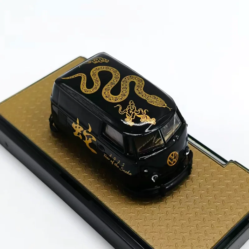 Imagine owning a beautifully crafted miniature of a vintage delivery van that instantly catches the eye with its sleek glossy black finish. Elevated by intricate gold accents, its roof features a large, stylized snake with swirling patterns, symbolizing the 2025 Year of the Snake. The side displays a bold Chinese character for “snake” along with elegant gold lettering, making it a perfect cultural collectible. Its rounded vintage shape, combined with detailed recessed doors, a prominent grille, and small side mirrors, offers an authentic nostalgic feel. Mounted on a textured black and gold display base, this model exudes class and sophistication, bringing a touch of history and artistry to your collection or decor.