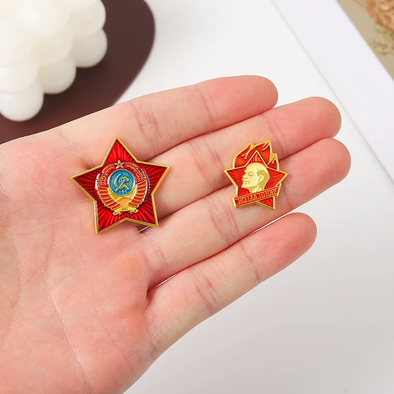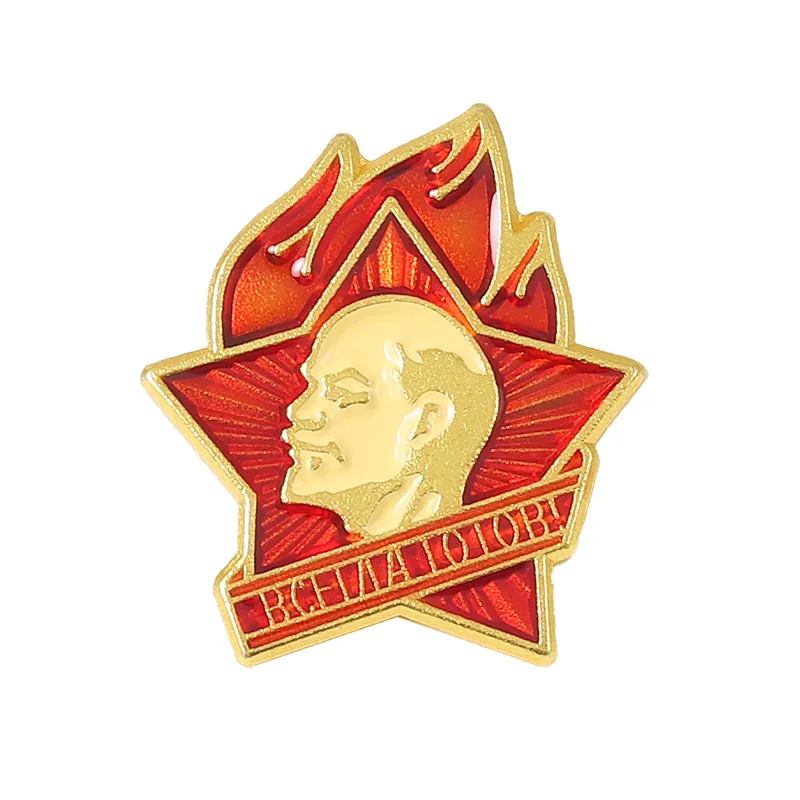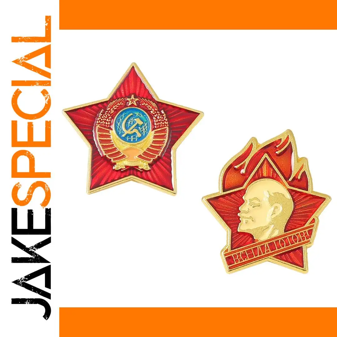 Immerse yourself in historical nostalgia with this beautifully crafted Soviet-style badge. Featuring a durable metal construction, it showcases a striking five-pointed star design accented with a gold-colored border. One badge displays a vibrant red background radiating with darker red lines, centered around a detailed Soviet emblem: a blue circle with a gold hammer and sickle, encircled by a gold laurel wreath and crowned with a small gold star. The other badge features a bold gold-profile portrait of Vladimir Lenin set against a red star background, highlighted by stylized orange and red flames, symbolizing fire and passion. Both badges evoke a vintage, collectible aesthetic with embossed details and vivid enamel-like colors, perfect for display or collectible collections. Customizable and regional, these badges embody a patriotic spirit rooted in Russian history.
