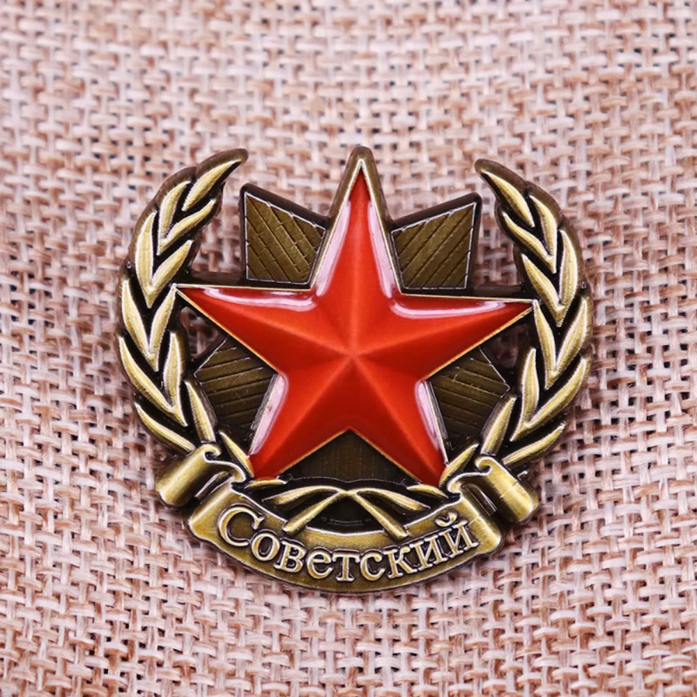 This vintage enamel pin brooch showcases a stunning Soviet star design, highlighted by a prominent red star with a glossy finish. Framed by elegant golden laurel branches, symbolizing victory, it features a classic banner inscribed with “Советский” beneath the star. The pin, crafted from durable copper, measures 3.5 cm by 3.5 cm, making it a versatile accessory for jackets, backpacks, hats, and various DIY clothing projects. Its rich red and gold colors, combined with dark accents, catch the eye and elevate any outfit, infusing a touch of retro military and patriotic style into your look.