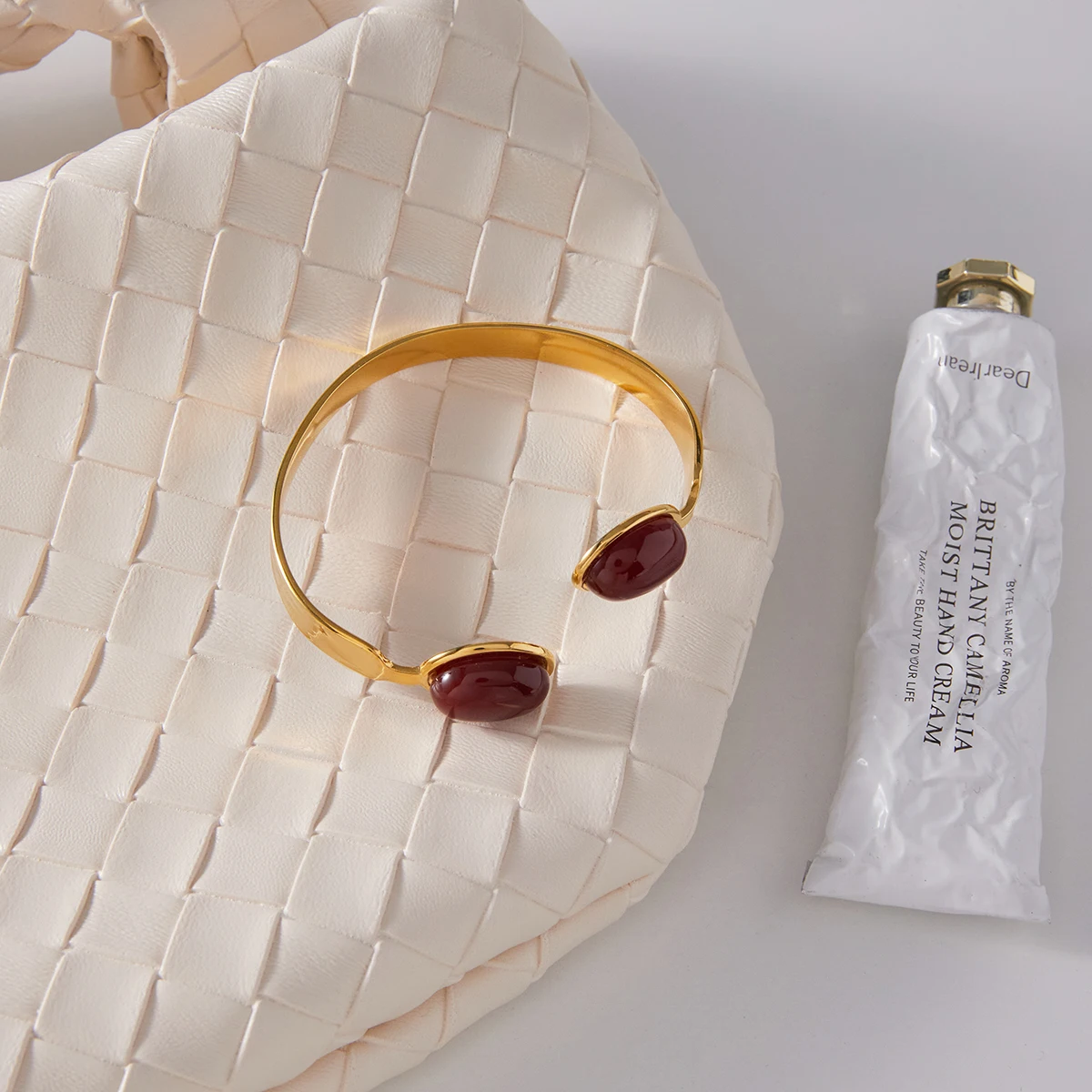 Experience the timeless charm of this vintage-inspired women's bracelet. Crafted from durable stainless steel with a lustrous platinum finish, it showcases a radiant gold hue that exudes sophistication. The centerpiece features two large egg-shaped agate stones in a deep, captivating red color. Each stone's glossy, polished surface highlights their natural translucency and unique patterns, adding a bold organic touch. Designed with a sleek cuff style, the bracelet is gently rounded and flexible, ensuring a comfortable, adjustable fit for any wrist. Its modern tension setting seamlessly secures the agate stones, blending natural elegance with contemporary craftsmanship. This high-quality jewelry piece offers a distinctive vintage aesthetic, perfect for elevating your everyday style or special occasions.
