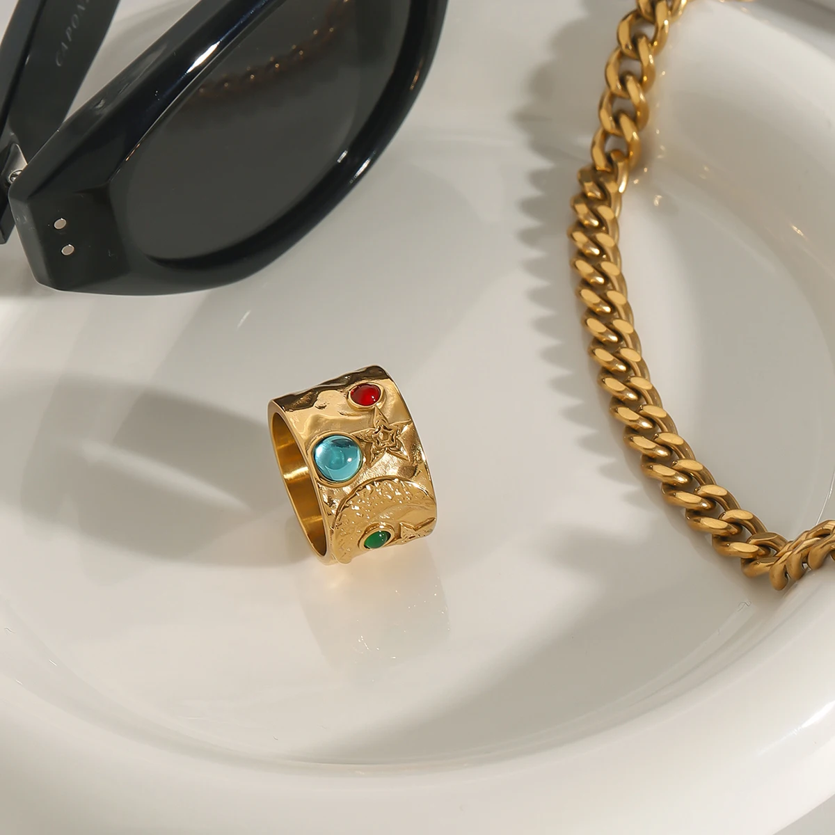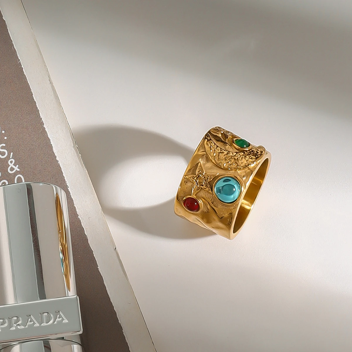 Step into a world of playful elegance with this stunning vintage-inspired women's ring. Crafted from durable stainless steel with a PVD gold finish, it offers long-lasting color, scratch resistance, and waterproof qualities. The ring’s delicate 2mm surface width features an intricate pave setting adorned with tiny, colorful stones arranged in joyful celestial motifs such as stars and moons. Its round shape and vibrant palette make it perfect for adding a cheerful, trendy touch to any party or fashionable occasion. The lively pattern and shiny golden surface make this piece stand out effortlessly, allowing you to express your unique style with confidence. Designed for everyday wear, this ring combines quality with a fun, whimsical aesthetic.