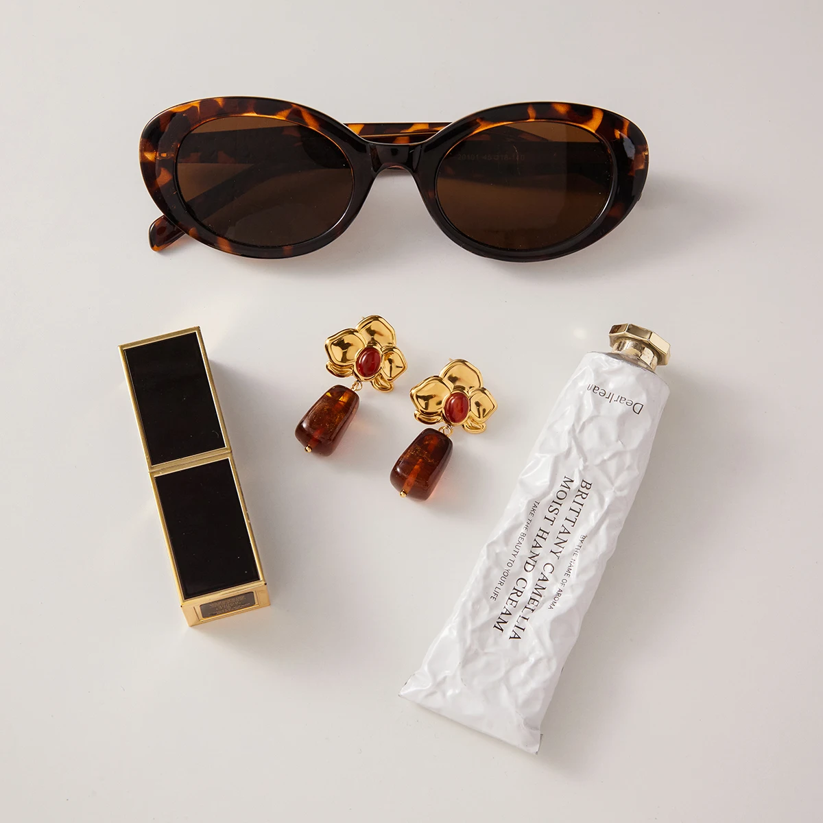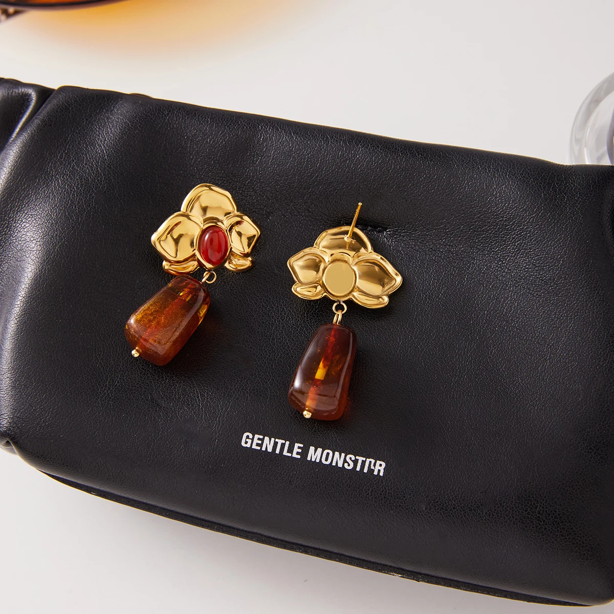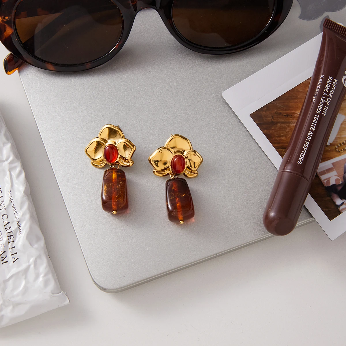 Experience timeless elegance with these vintage-inspired drop earrings, crafted to elevate your autumn and winter wardrobe. Featuring a sophisticated water drop shape, these earrings combine intricate craftsmanship with warm, inviting colors. The top portion showcases a delicate floral or butterfly motif made from shiny, gold-colored stainless steel, with rounded, smooth petal and wing shapes. At the center, a vivid red oval agate stone adds a striking focal point. Dangling below is a semi-translucent amber resin pendant with gentle brown tones and natural inclusions, evoking organic beauty. Crafted without high-concern chemicals, these earrings are perfect for those who appreciate vintage style with a touch of natural charm. Their luxurious yet earthy design makes them an ideal statement accessory for any sophisticated wardrobe.