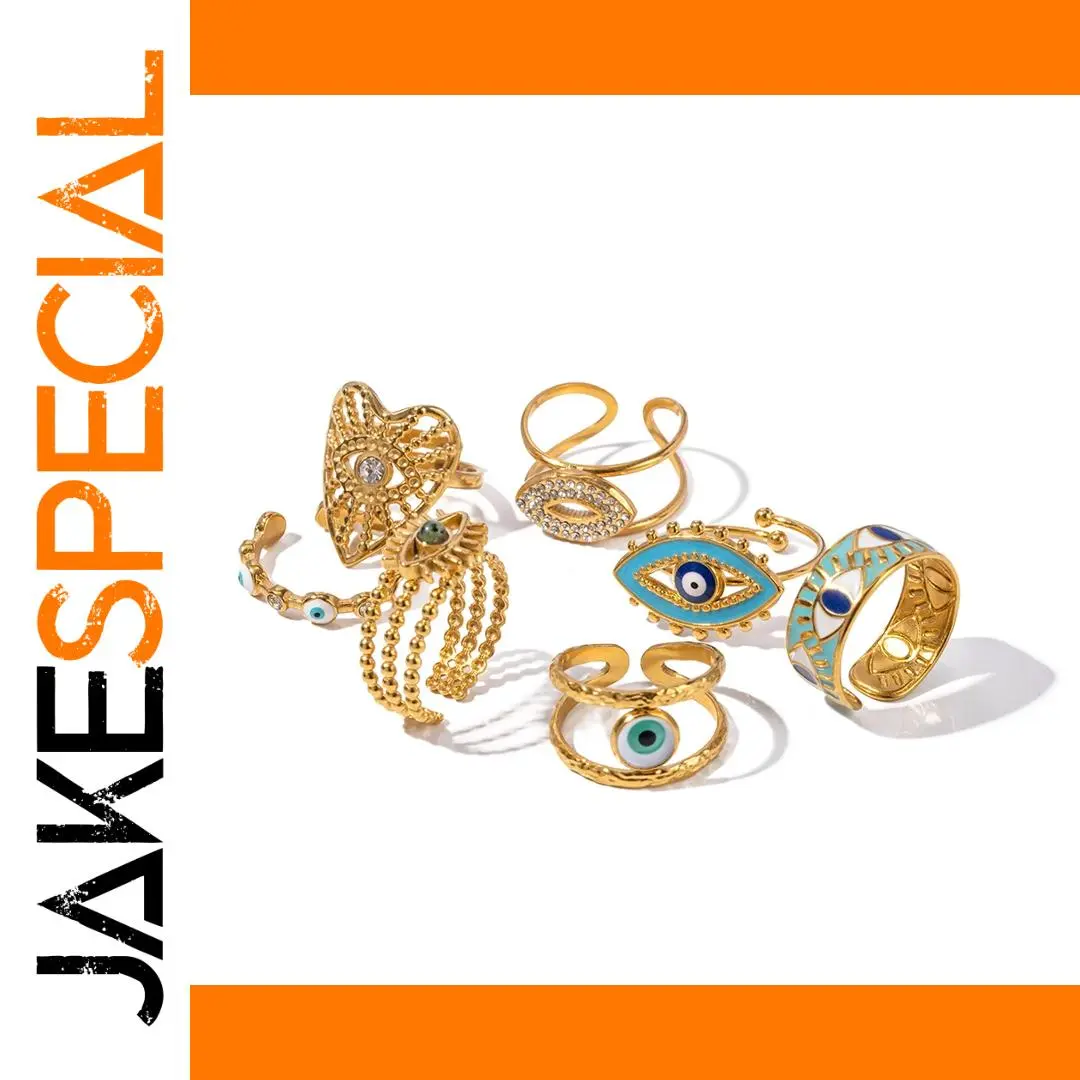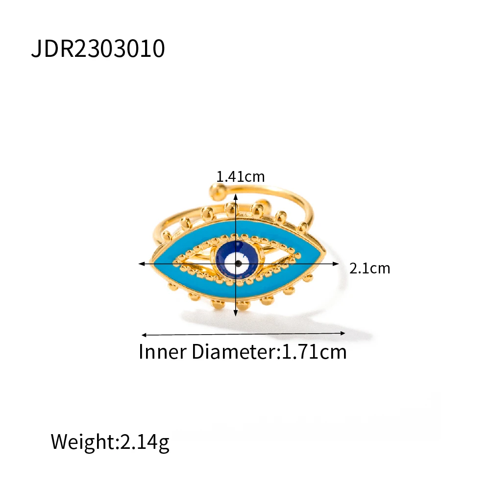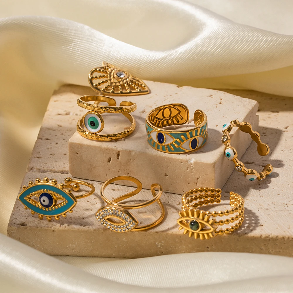 Experience the captivating charm of this vintage evil eye ring, designed to elevate your jewelry collection with its bold yet sophisticated style. Crafted from durable stainless steel with a luxurious gold-tone finish, this ring combines resilience with elegance. The geometric, open-ended, adjustable design ensures a comfortable fit for various finger sizes and allows you to effortlessly layer it with other pieces for a personalized look. The striking evil eye motif is embellished with sparkling crystals and vibrant enamel accents in turquoise, white, and dark blue, symbolizing protection and style. Whether worn at parties, casual outings, or special occasions, this piece enhances your aesthetic with a perfect blend of modern trend and traditional symbolism. Make it your signature accessory today.