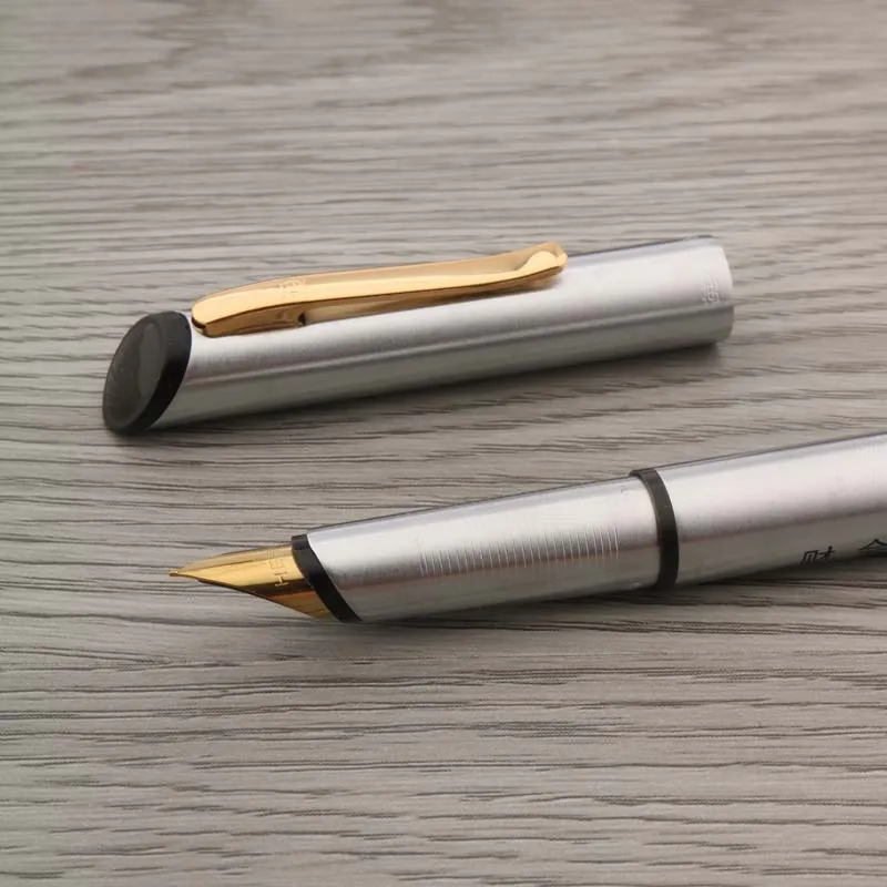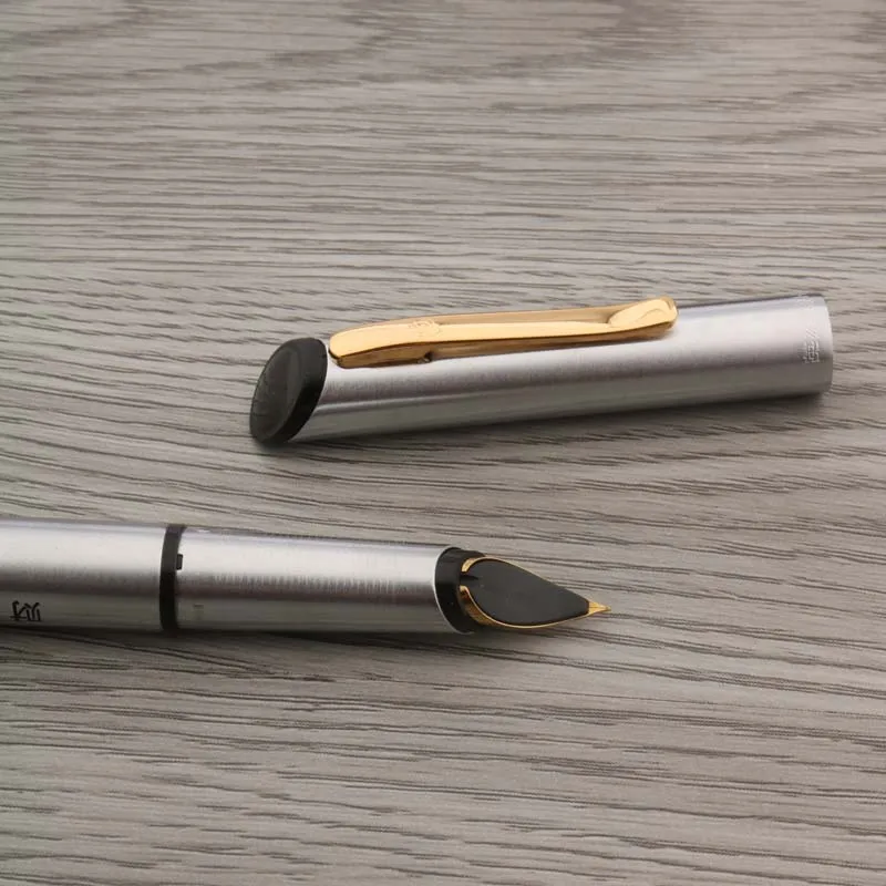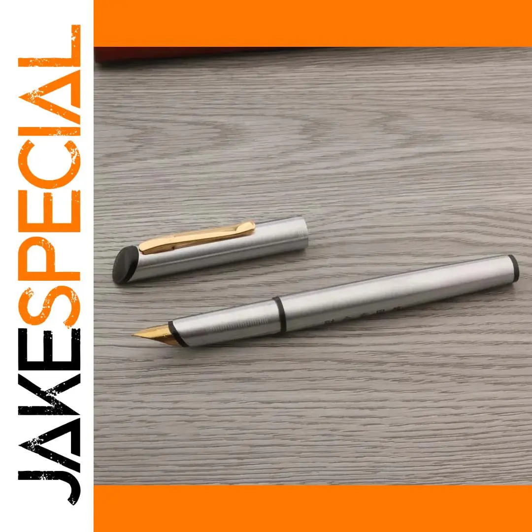 Discover the timeless charm of this vintage-style stainless steel fountain pen, produced in the 90s. Its sleek, cylindrical body blends retro aesthetics with modern craftsmanship, featuring a brushed or polished metallic finish that subtly reflects light. The gold-colored nib and shiny clip provide elegant contrasts against the cool stainless steel body, enhancing its classic yet contemporary look. The cap, with its rounded end and black ring, complements the streamlined design, making it an ideal accessory for professionals and enthusiasts alike. Whether for everyday writing or special documents, this pen offers refined precision, durability, and style. Experience the smooth performance and nostalgic appeal of this sophisticated writing instrument—your new favorite tool for work or personal expression.