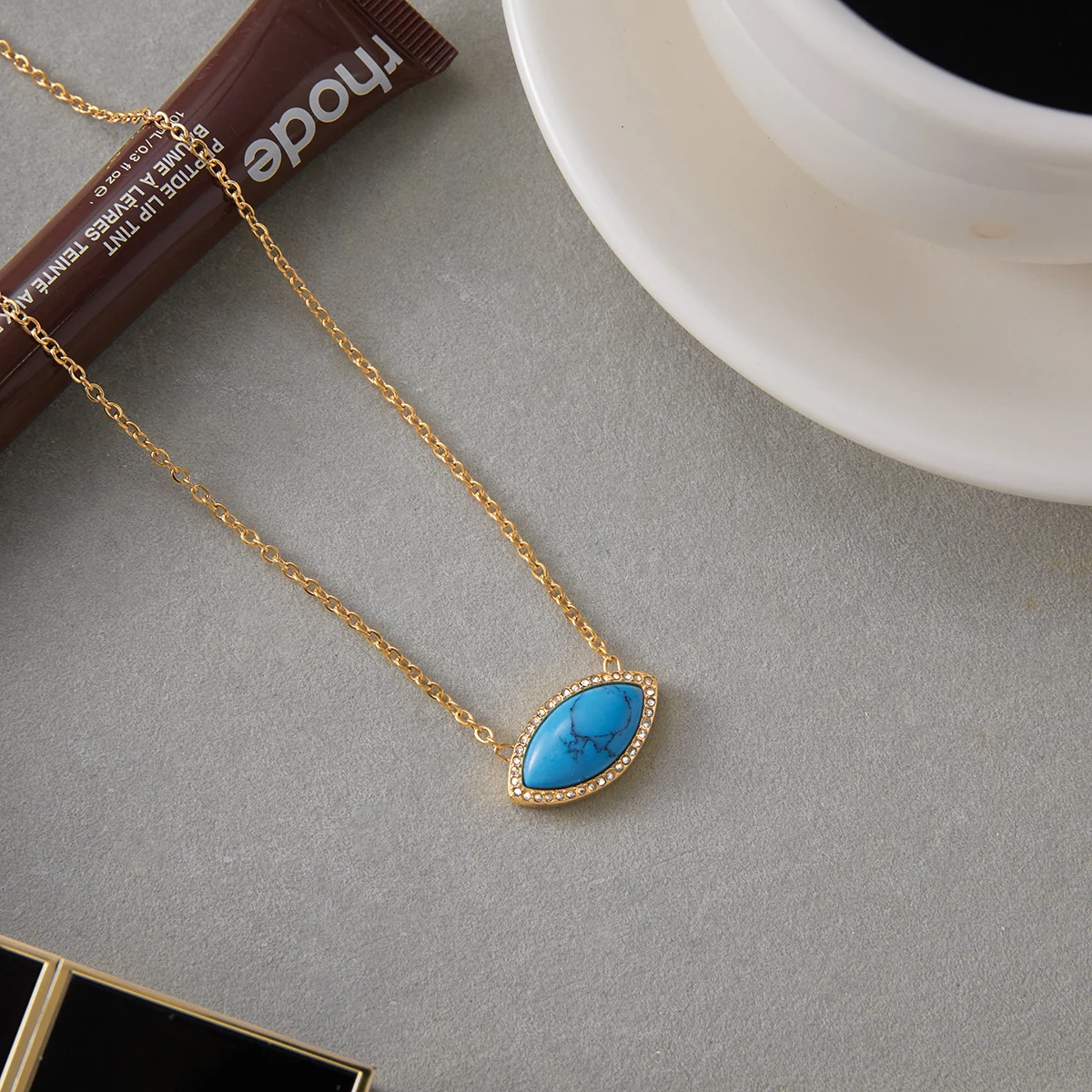 Imagine adding a touch of sophistication to your outfit with this vintage-inspired necklace. Crafted from durable stainless steel with a stunning gold-tone finish, it features a delicate, fine link chain that comfortably rests around your neck. The centerpiece is a beautiful round pendant showcasing a bright blue turquoise stone, set within a matching gold bezel. Encircling the turquoise are sparkling zircon stones that reflect light beautifully, enhancing the pendant’s luxurious appeal. Perfect for any occasion, this necklace combines timeless charm with modern elegance, making it a versatile accessory for your wardrobe. Its waterproof design ensures durability, so you can wear it confidently every day or for special events.