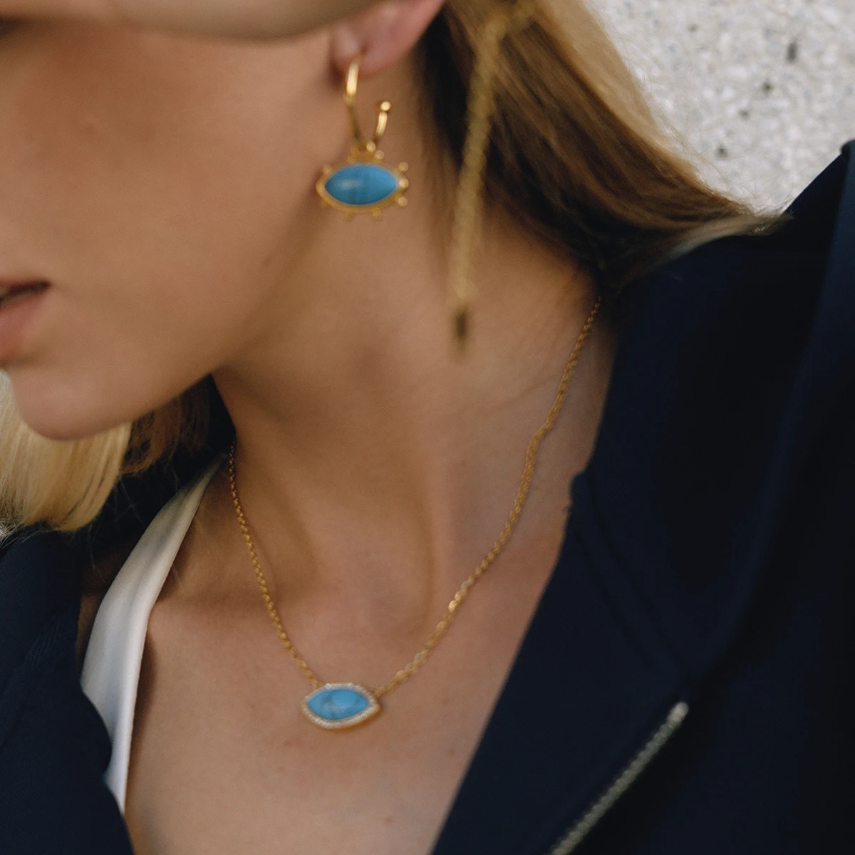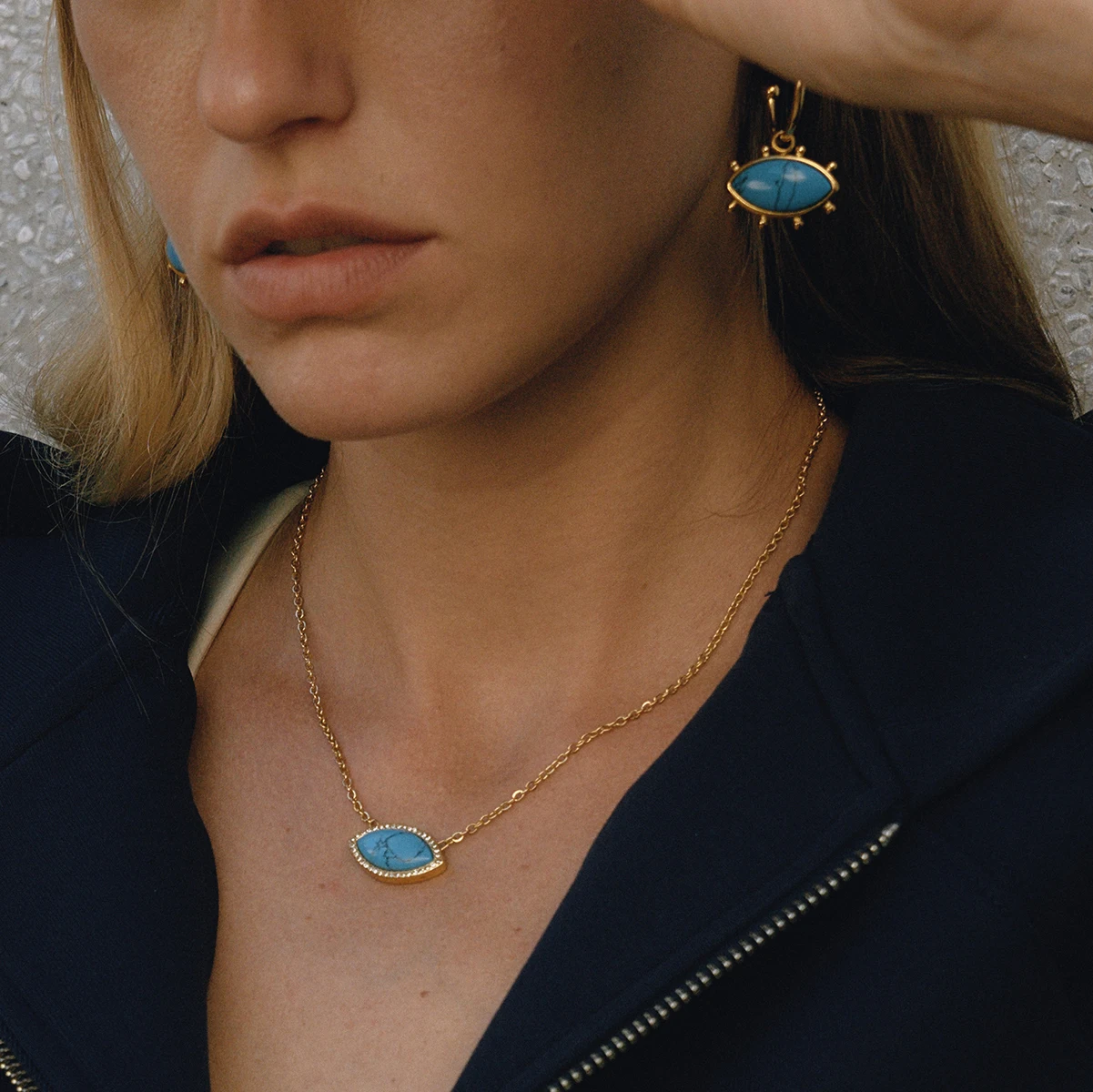 - Features a round pendant with a striking blue turquoise inlay and a border of sparkling zircon stones, adding elegance and sparkle.