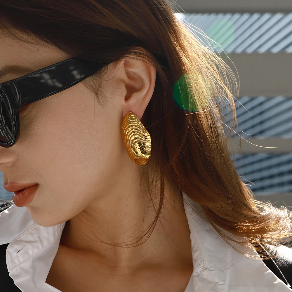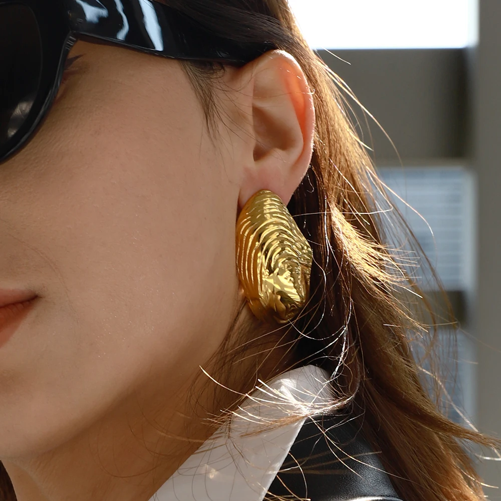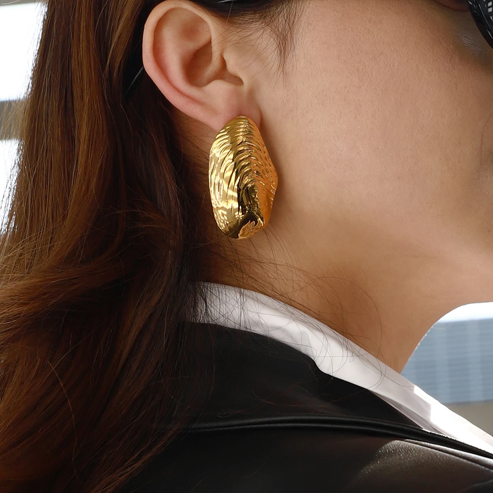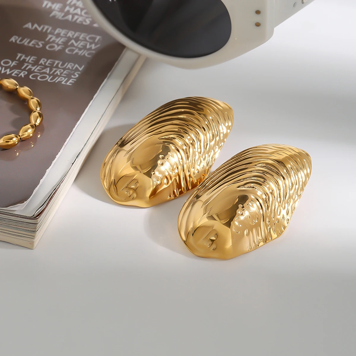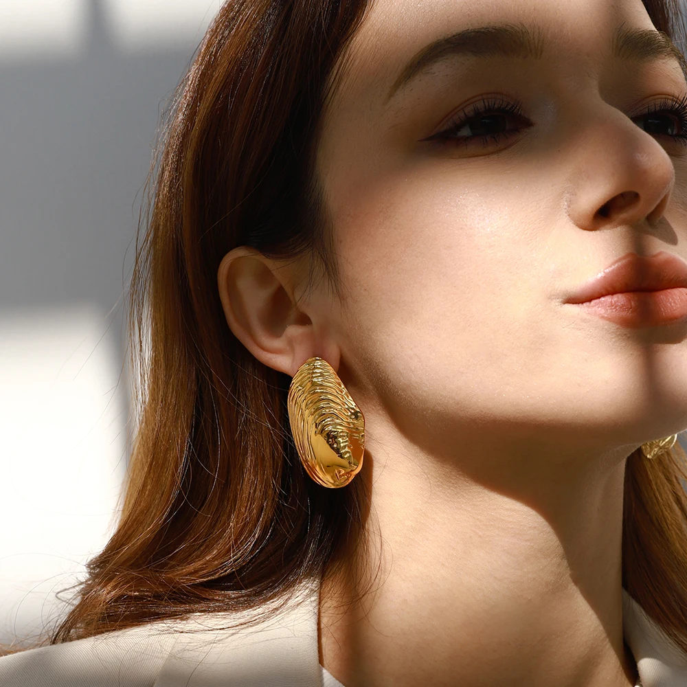 Elevate your jewelry collection with these stunning vintage clam shell earrings, crafted from high-quality stainless steel with a durable PVD gold finish. The bold, oversized design resembling a seashell instantly draws attention and adds a sophisticated yet trendy touch to your outfits. Perfect for parties or fashionable gatherings, these earrings are designed to make a statement while ensuring comfort and longevity. Their shiny, reflective gold tone catches the light beautifully, highlighting the textured, ribbed shell shape. Lightweight at approximately 15 grams, they are comfortable for all-day wear. Water-resistant and free from nickel, lead, and cadmium, these earrings promise both style and safety. Make your look unforgettable with these eye-catching accessories.