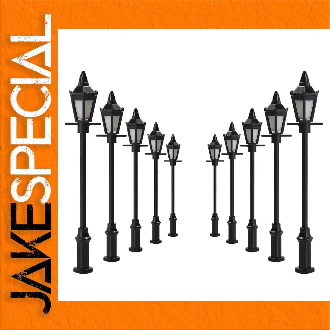 - Set includes 10 vintage-style metal lamp posts with detailed black finish, each approximately 6.8 cm tall for realistic scale modeling. Perfect for adding vintage charm to your scenes.
