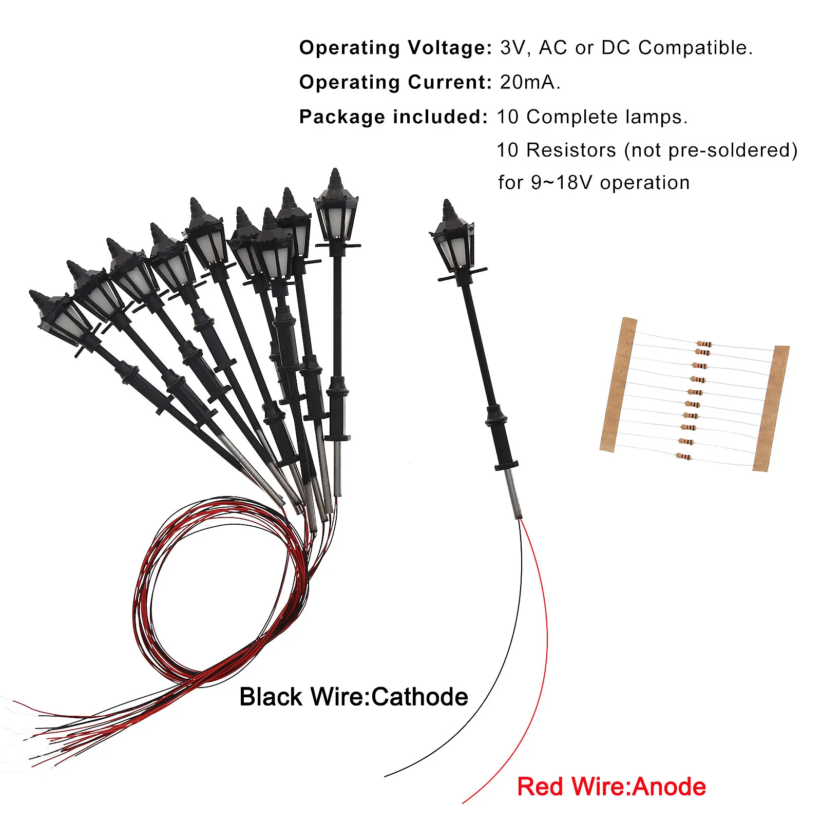 Enhance your miniature cityscape with this meticulously crafted set of ten vintage street lamp posts, perfect for OO or HO scale models. These black metal lamp posts exude timeless charm, featuring slender, elegant designs topped with faceted pyramid-shaped lanterns. Equipped with warm white LEDs, they emit a cozy, inviting glow that creates a realistic street ambiance. Designed for easy integration into your model railway or diorama, each post is approximately 6.8 cm tall, making them ideal for creating charming urban or historic scenes. The set includes all necessary wiring and resistors, allowing safe operation at 3V or higher voltages with proper adjustments. Add a nostalgic touch and authentic lighting to your miniature environment with these beautiful vintage lamp posts.
