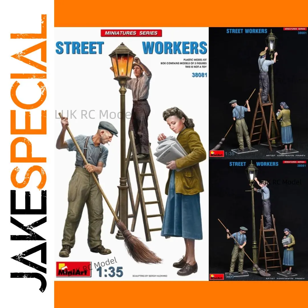 Bring a nostalgic street scene to life with this 1/35 scale static assembly model of a vintage street worker, crafted from durable plastic. Featuring highly detailed, realistic illustrations of figures in mid-20th-century attire—such as a worker sweeping with a broom, a woman reading a newspaper in a yellowish-brown jacket and blue skirt, and a man on a ladder repairing a street lamp—this kit offers a rewarding building experience. Designed for ages 14 and older, it requires tools like glue and paint to assemble and customize. The final scene showcases craftsmanship and authenticity, perfect for collectors and model enthusiasts who appreciate vintage charm.