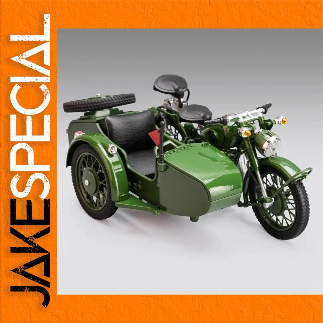 Discover the stunning craftsmanship of this vintage-inspired sidecar trike model, meticulously crafted at a 1:10 scale. Its glossy military green finish exudes a rugged yet classic appeal, perfect for collectors and enthusiasts. The rounded, smooth shapes and chrome accents on the headlight bezel add a retro touch, while the spoked wheels with textured black tires enhance its realism. Silver handlebars with black grips and small yellow indicator lights provide subtle contrast. The attached sidecar shares the same glossy hue and rounded shape, complete with a black interior seat and horizontally mounted spare tire. This model features sound and light functions, activated by a button battery, making it a dynamic display piece or gift for mature collectors. Crafted entirely from metal, it combines durability with authentic aesthetic details.