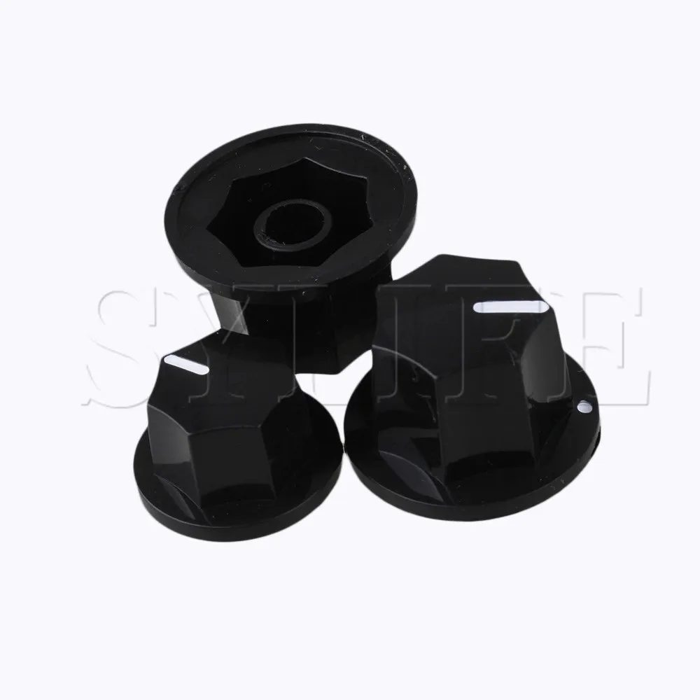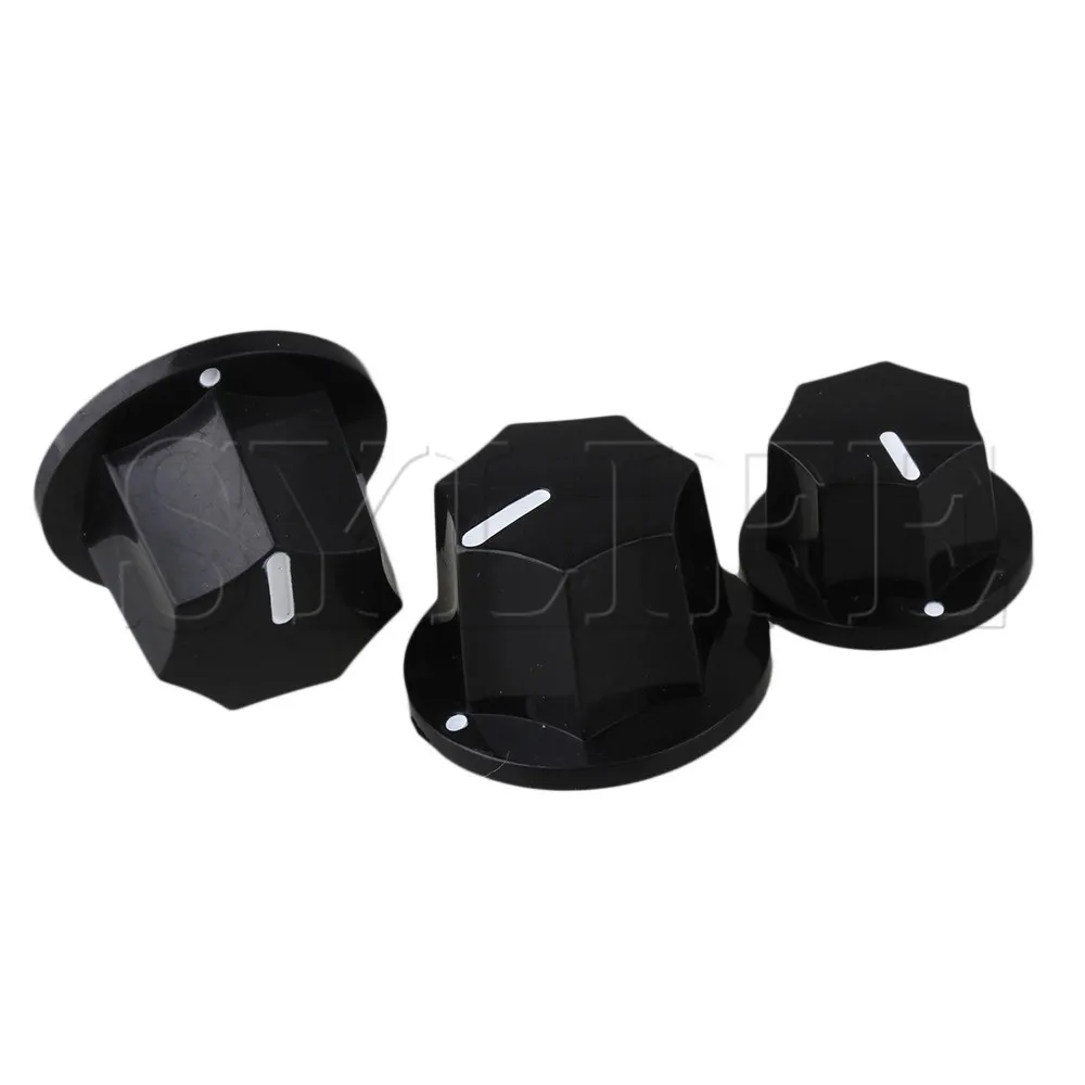 Step up your bass guitar's look and functionality with this set of three vintage-style black knobs designed specifically for electric bass guitars with a 6mm split shaft. Crafted from durable plastic with a glossy finish, these knobs add a sleek, retro aesthetic to your instrument. The set includes two larger knobs for volume control and a smaller one for tone adjustment, each featuring a crisp white indicator line to ensure precise settings. Their press-fit design makes installation quick and secure, allowing you to focus on your music without fuss. Whether you're refurbishing or customizing, these knobs bring a mix of vintage charm and modern reliability to your bass guitar setup—enhancing both style and playability.