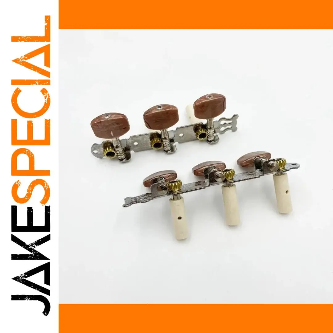 Imagine upgrading your classical guitar with these exquisite vintage-style tuning machine heads, offering both aesthetic charm and reliable performance. Crafted with a unique retro design, the set features square agate-like heads in a warm, natural light brown or tan color, showcasing subtle wood grain textures. The silver-colored metal components provide a refined, timeless look, complemented by gold-toned gear wheels that add contrast and elegance. The white cylindrical tuning keys with rounded ends ensure smooth tuning adjustments. Designed for durability, these precision-engineered tuners will seamlessly blend with your guitar’s classic aesthetic while delivering stable tuning. Perfect for restoring or customizing your instrument, they bring a vintage vibe to your music.