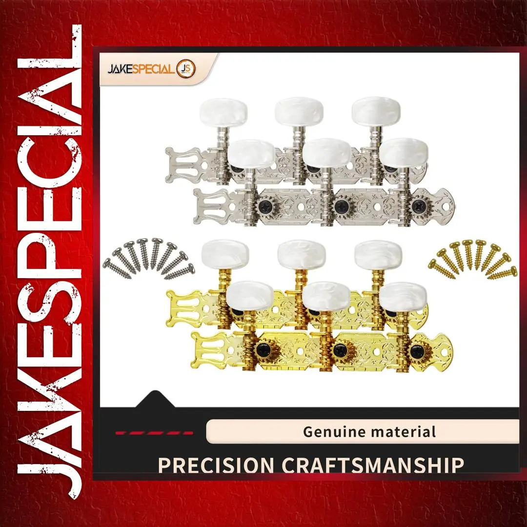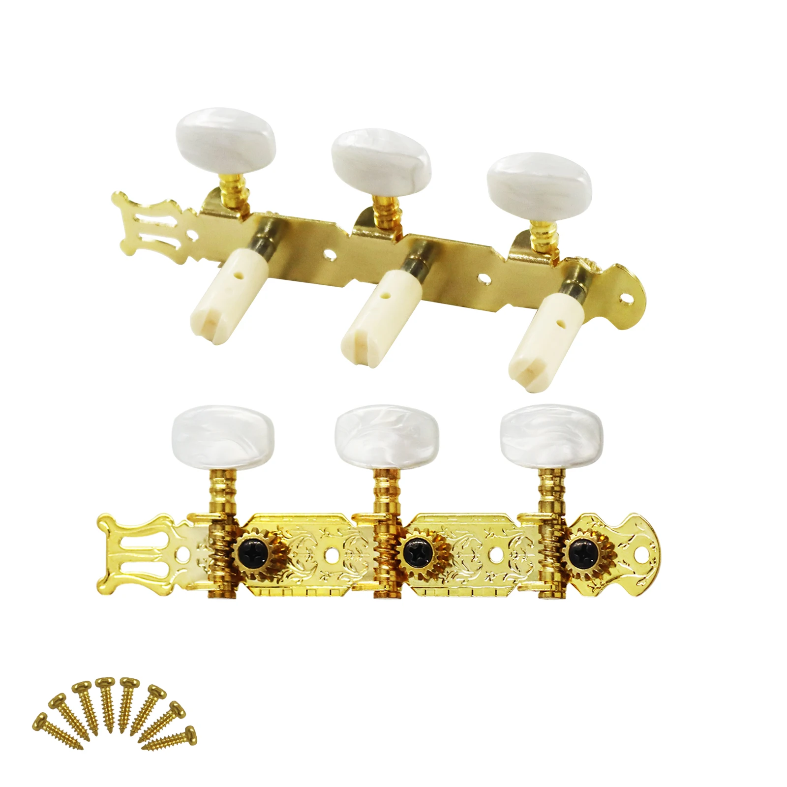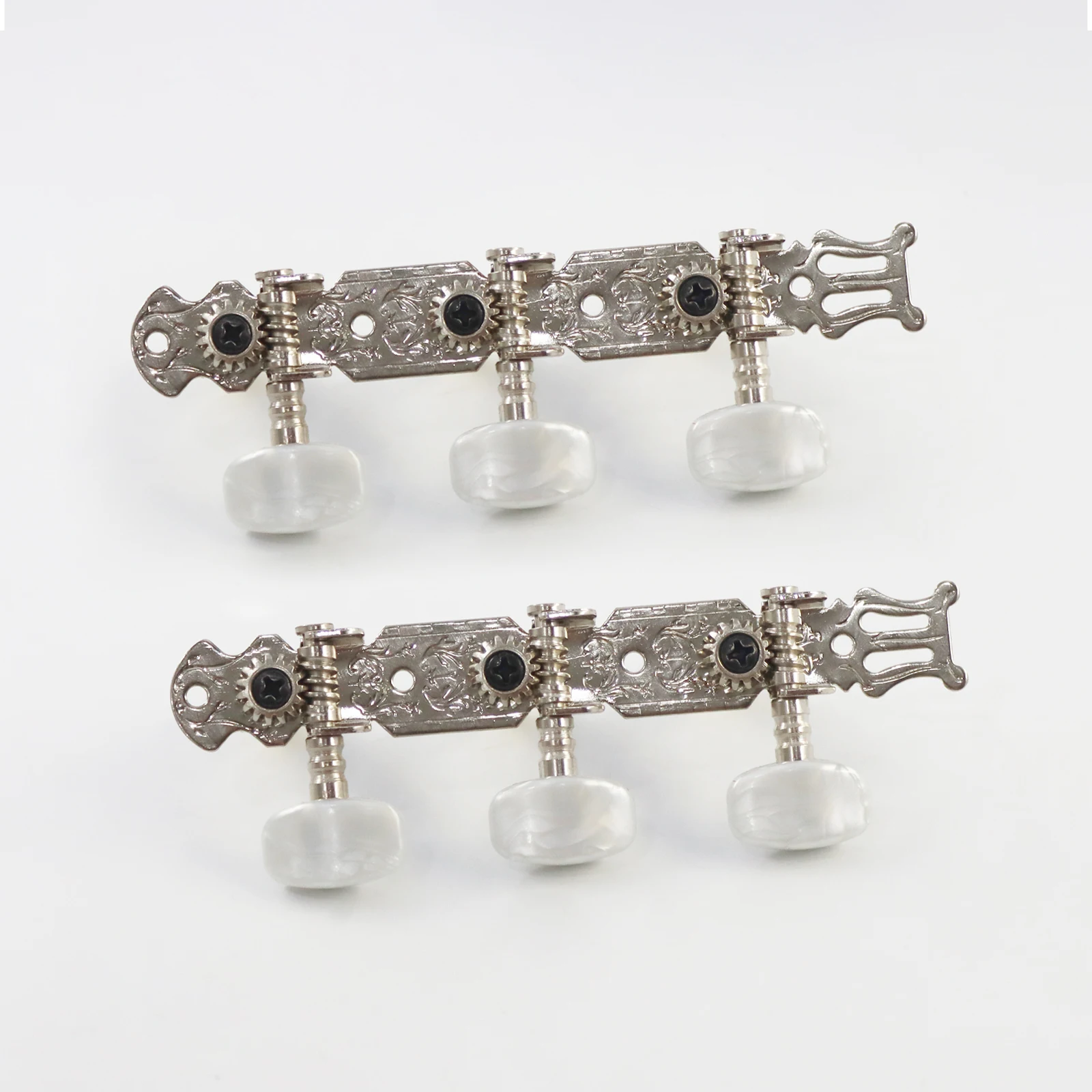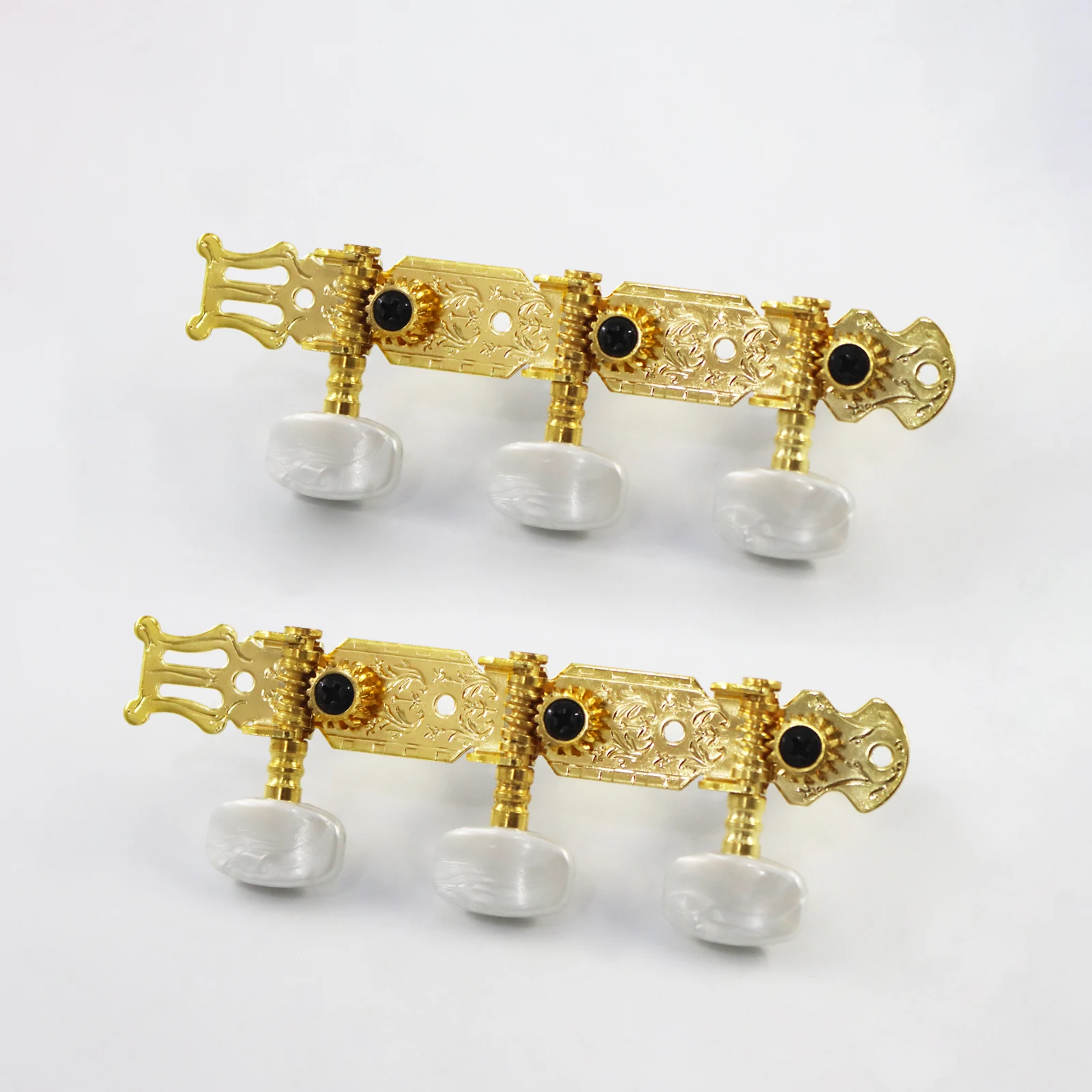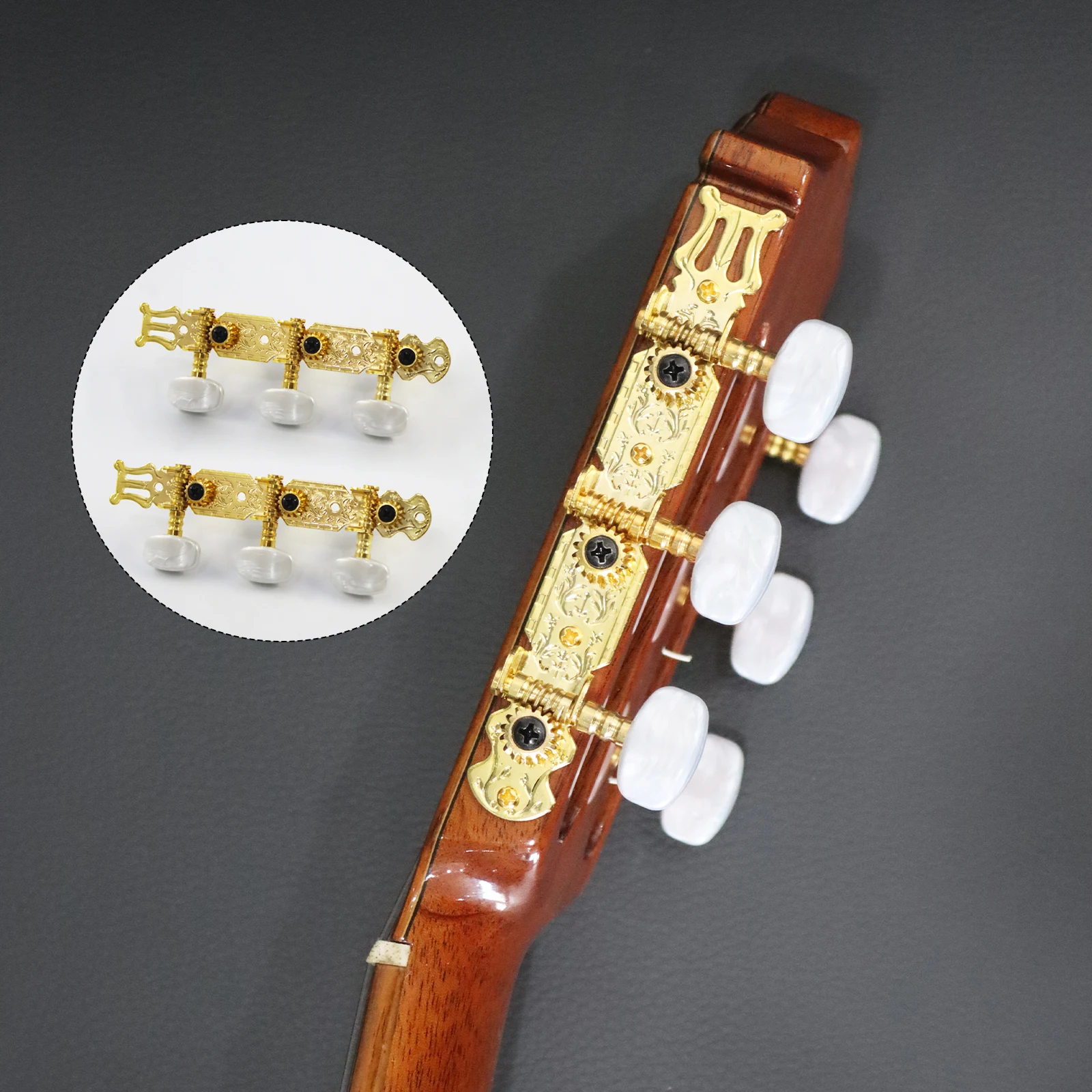 Enhance your guitar’s appearance and performance with this pair of classical guitar tuning pegs, featuring a stunning vintage design. Crafted for smooth and accurate adjustments, these tuners help keep your guitar perfectly in tune during every practice or performance. Made from durable iron and chrome-plated steel, they promise longevity and reliable tuning stability. The intricate engraved metal plates add a decorative, elegant touch, making them suitable for customizing your instrument or replacing worn parts effortlessly. Available in two beautiful finishes— lustrous gold and sleek chrome—these tuning pegs blend style with functionality. Easy to install, they offer a seamless upgrade for both beginner and seasoned musicians seeking high-quality hardware for their guitars.