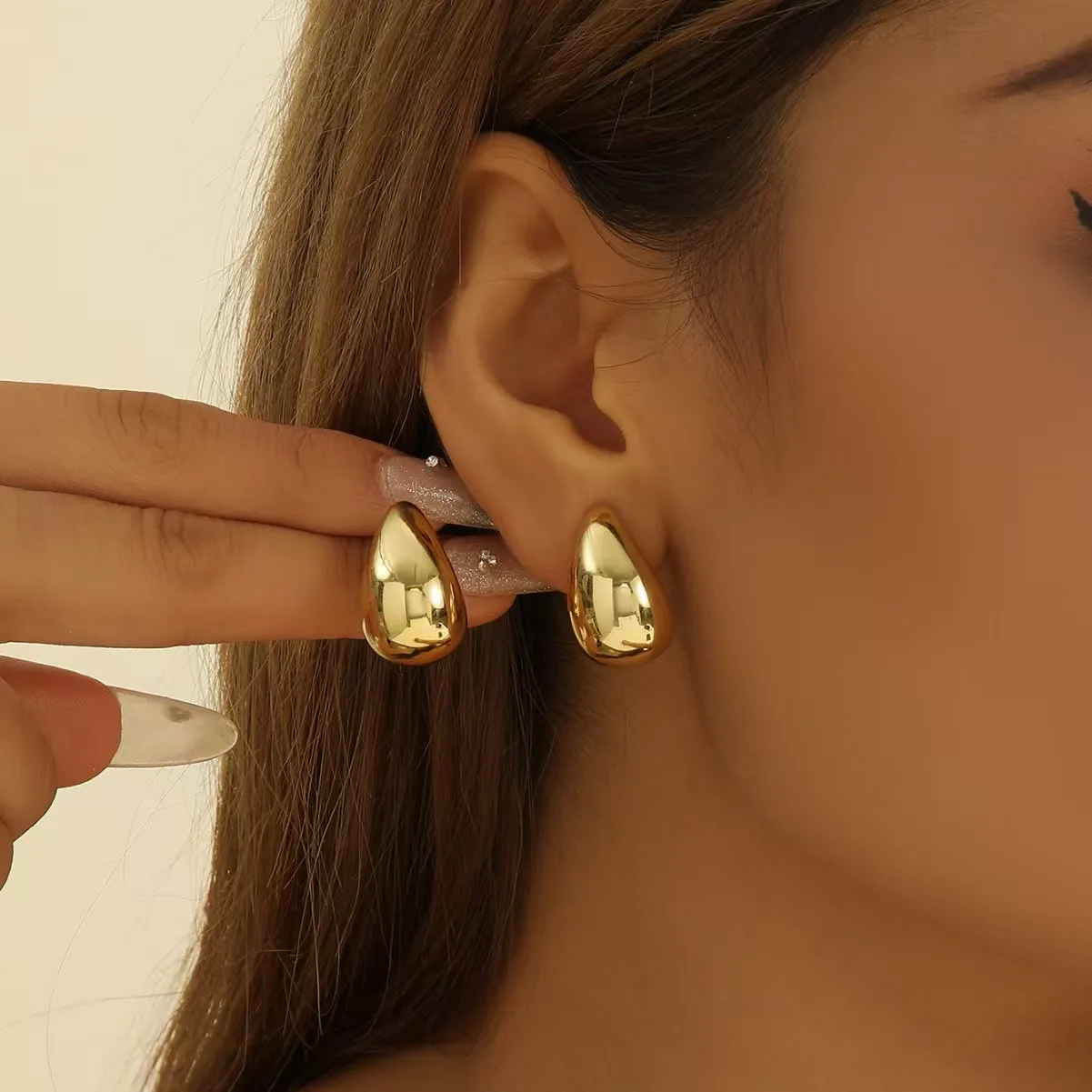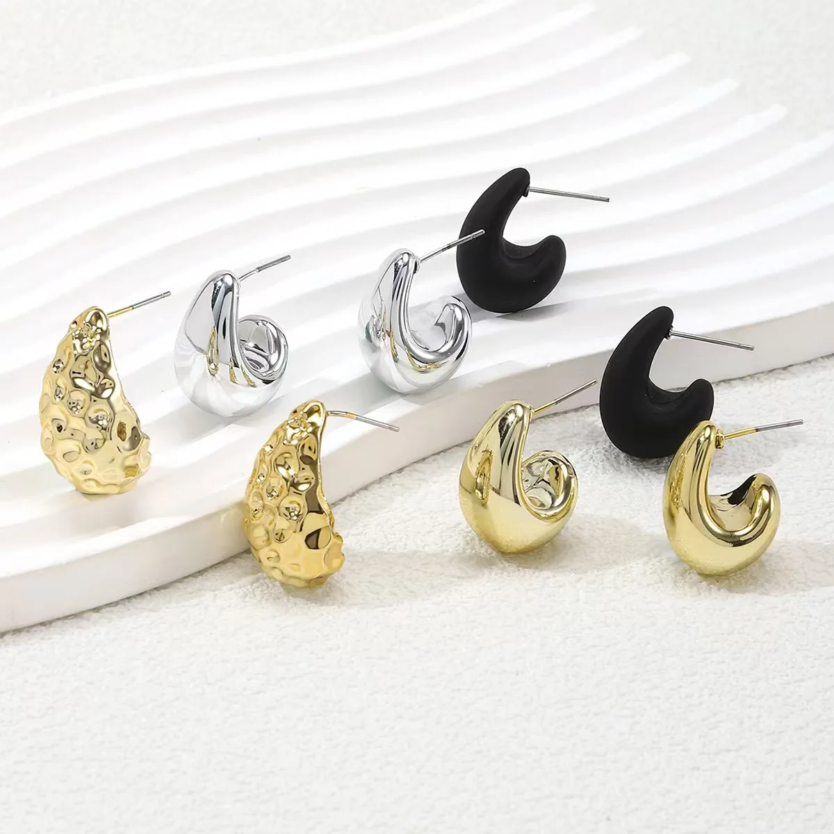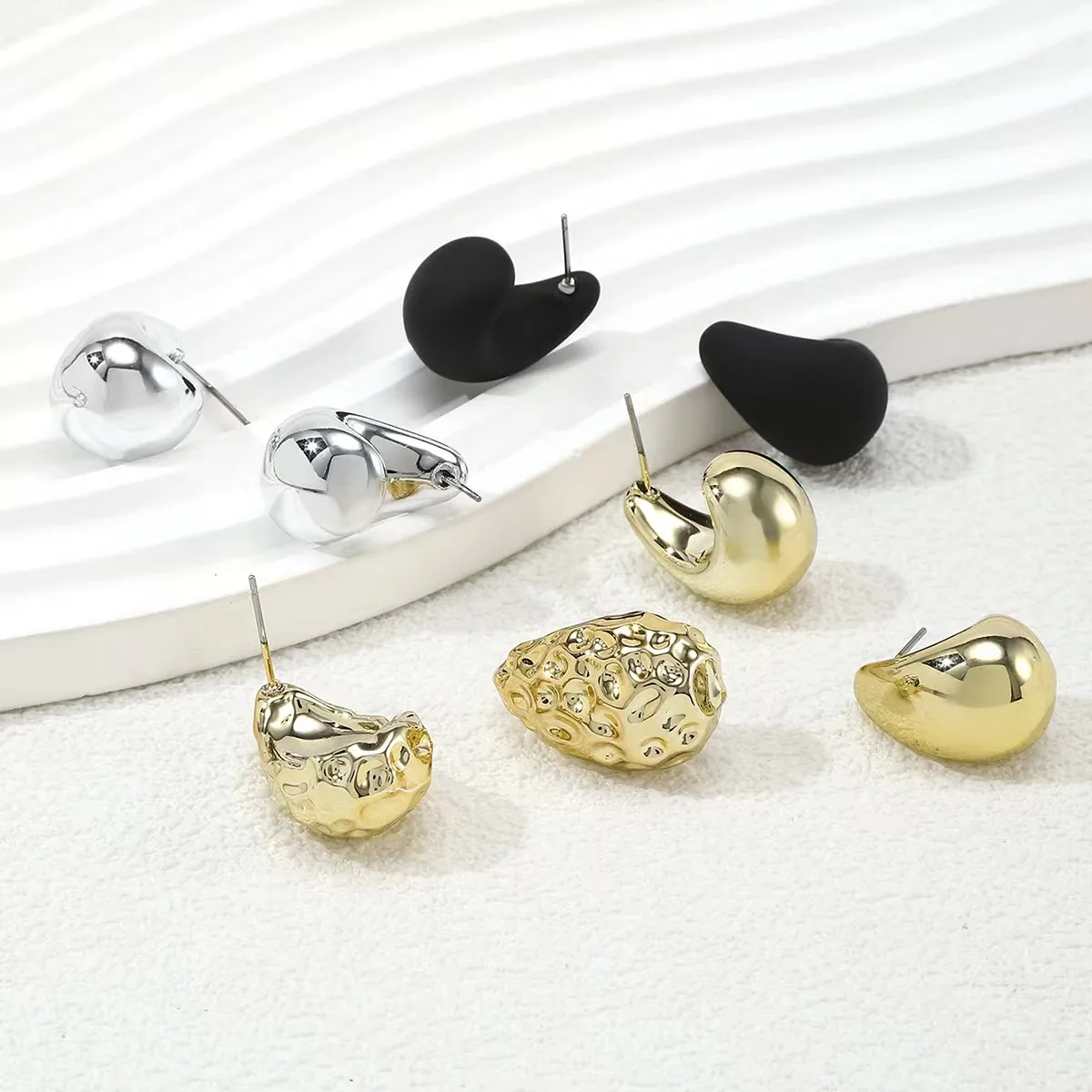 - Water drop shape design, with each pair showcasing a distinct style: smooth matte black, shiny silver, irregular porous gold, and sleek glossy gold, perfect for versatile vintage fashion statements.