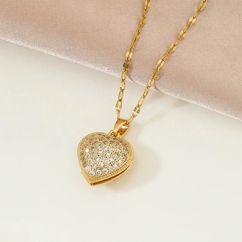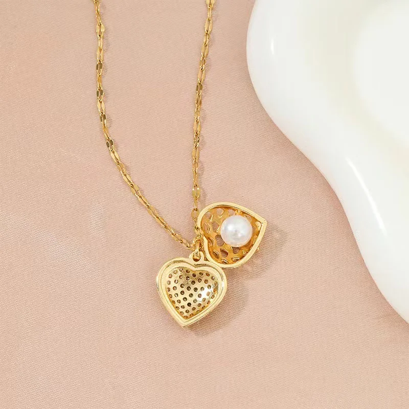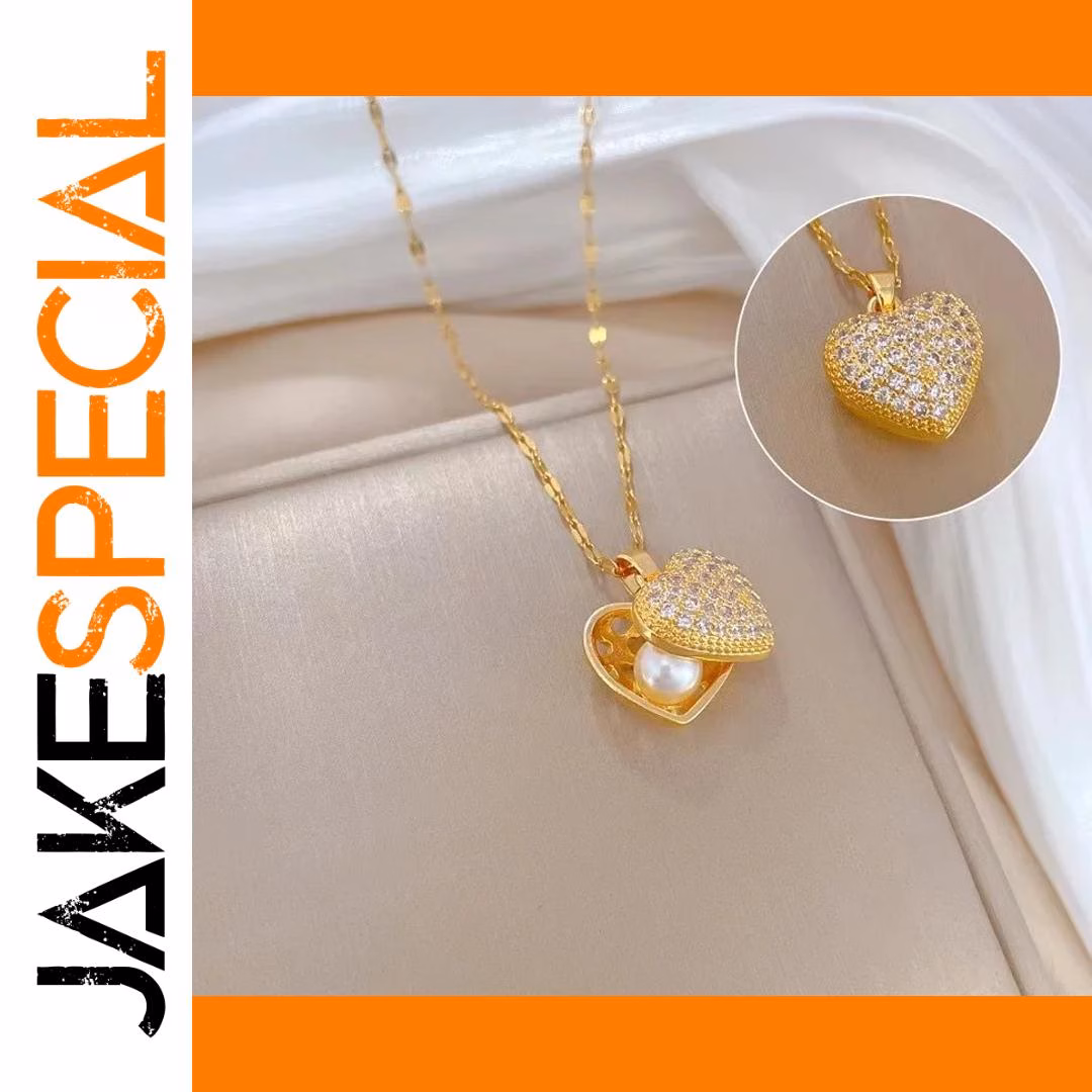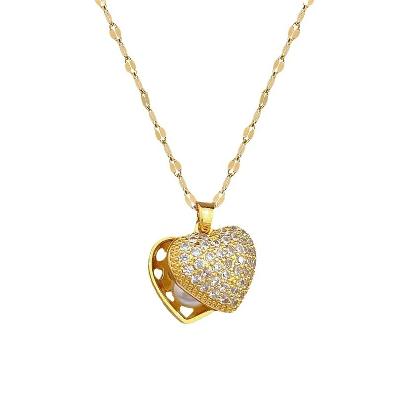 Imagine enhancing your special outfit with this stunning vintage-inspired necklace, perfectly blending classic charm and contemporary sparkle. Crafted with a delicate gold-colored stainless steel chain, it offers durability and timeless beauty. The heart-shaped pendant, measuring approximately 1 to 5 centimeters, features a dazzling pavé setting of cubic zirconia on the upper half, creating a textured, glittering surface that draws attention. The lower part showcases a lustrous pearl-like sphere, partially visible through an intricate, cut-out gold cover, adding a touch of sophistication. Ideal for anniversaries or elegant occasions, this necklace makes you feel special every time you wear it, elevating your jewelry collection with its refined design.