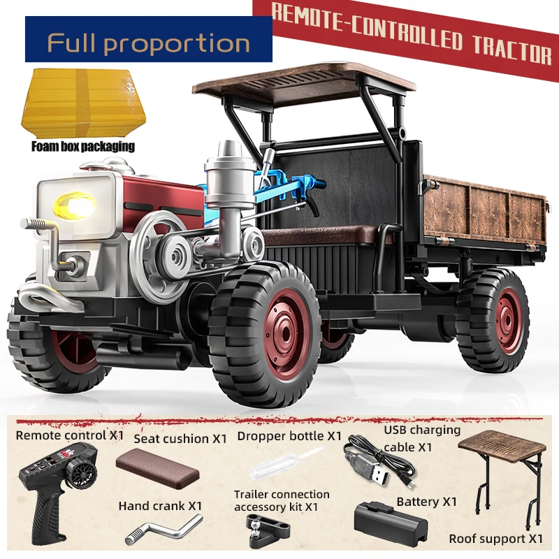 Experience the thrill of controlling this full-scale, retro-style remote control tractor that combines durability with classic charm. Its metallic silver finish and boxy, industrial design evoke a sense of vintage ruggedness, while modern features like 4WD and a high-torque motor provide exceptional performance. Whether you're aiming for realistic play or professional display, this tractor's detailed design and functional capabilities will captivate your attention. Imagine yourself maneuvering this sturdy replica through various terrains, experiencing the dynamic sound effects and exhaust spray features that add authenticity. Its impressive 40-meter control range allows for wide-ranging adventures, making this a perfect addition for remote control enthusiasts and collectors alike.