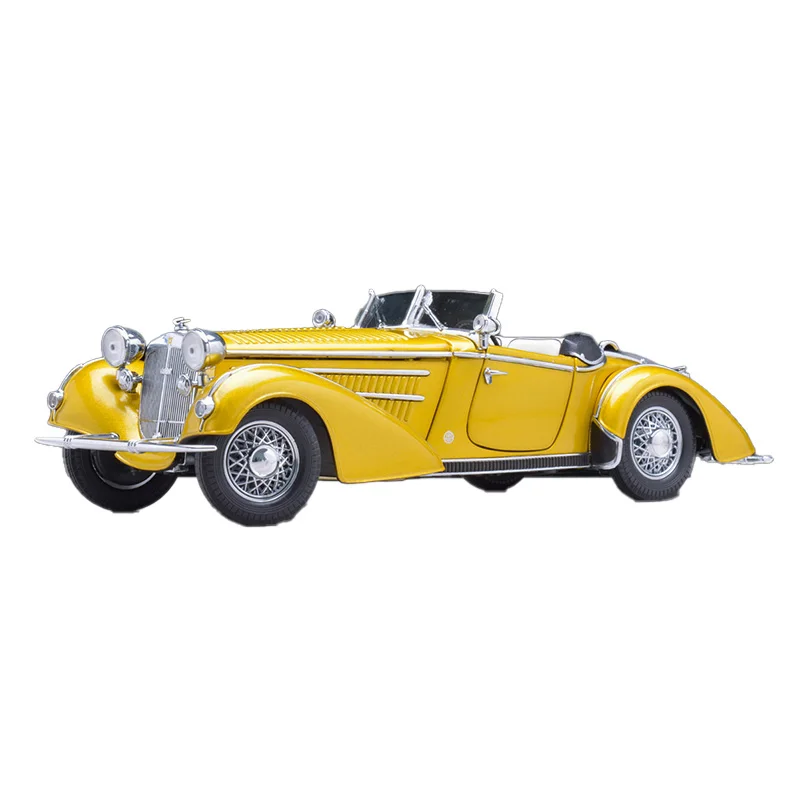 Immerse yourself in nostalgia with this exquisitely crafted 1:18 scale vintage car model by Sun Star. The model boasts a striking metallic gold exterior that radiates luxury and timeless elegance. Its smooth, flowing contours replicate the iconic design of 1930s or 1940s European sports cars, featuring rounded fenders and an aerodynamic elongated body. The front grille with vertical slats, complemented by large round headlights and auxiliary lamps, enhances the classic look. Wire-spoked wheels with silver hubcaps and black tires add authenticity and fine detail, while chrome accents on bumpers, mirrors, and trim elevate its polished appearance. The open top reveals a finely detailed black interior with realistic seats, dashboard, and steering wheel, perfectly capturing vintage charm and craftsmanship. Perfect for collectors and enthusiasts, this model is a tribute to automotive elegance.
