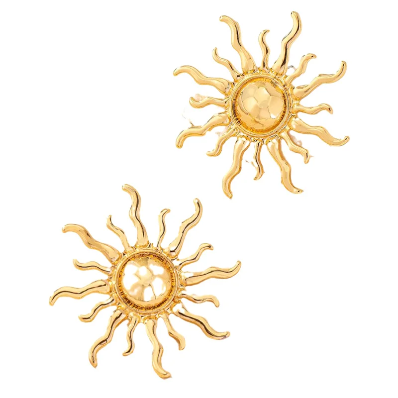 Add a bold touch to your style with these vintage oversized sun-themed drop earrings, crafted from zinc alloy with a shiny gold electroplated finish. Featuring a striking sun motif with a polished, reflective central core and dynamic, wavy rays extending outward, these earrings exude vintage elegance and personality. Measuring approximately the size shown in the reference image, they are designed for women and girls seeking a statement accessory that captures attention and showcases individual style. Handcrafted with high-quality, non-harmful materials, these earrings are perfect for elevating your everyday look or making a special occasion truly memorable.