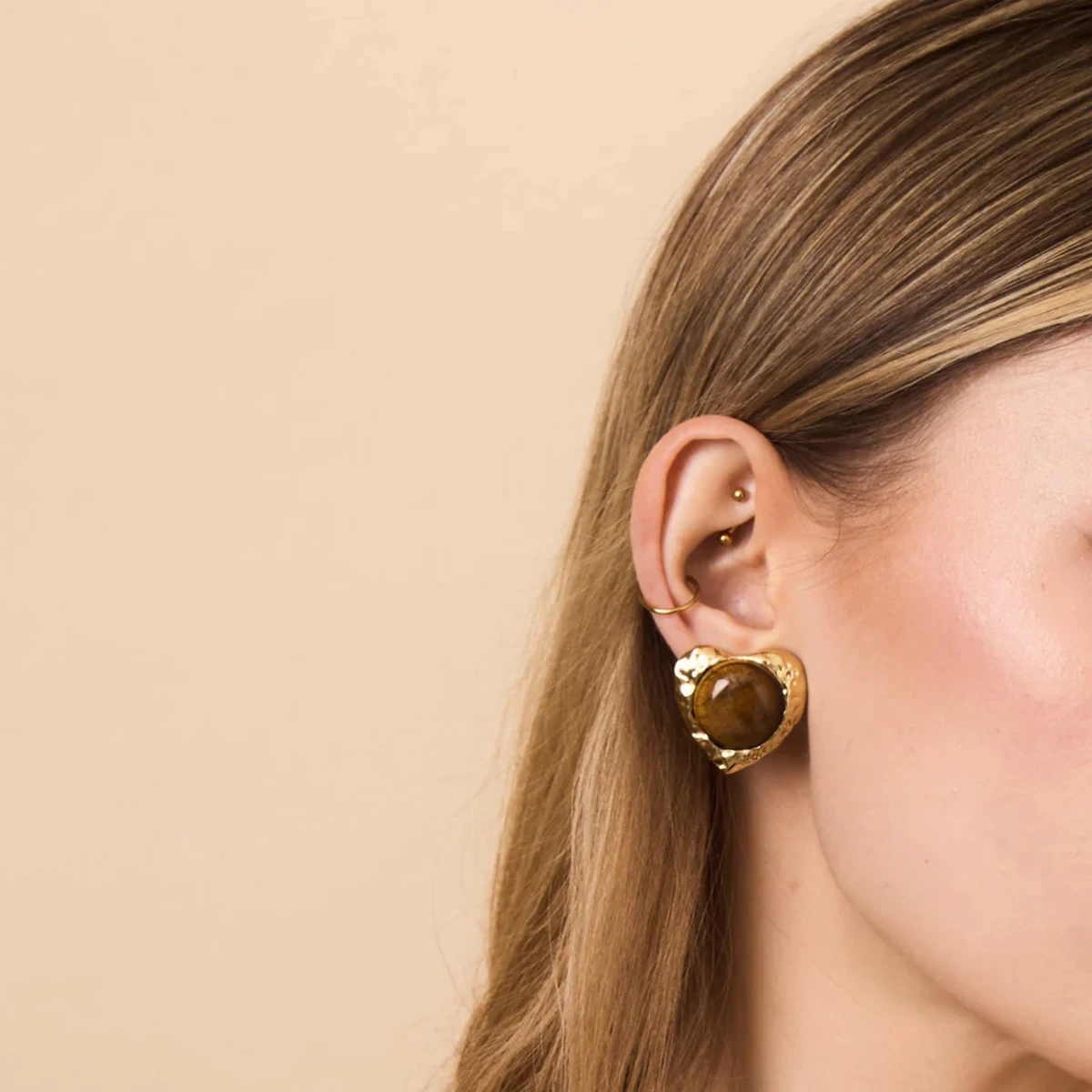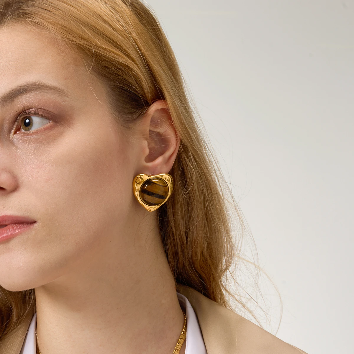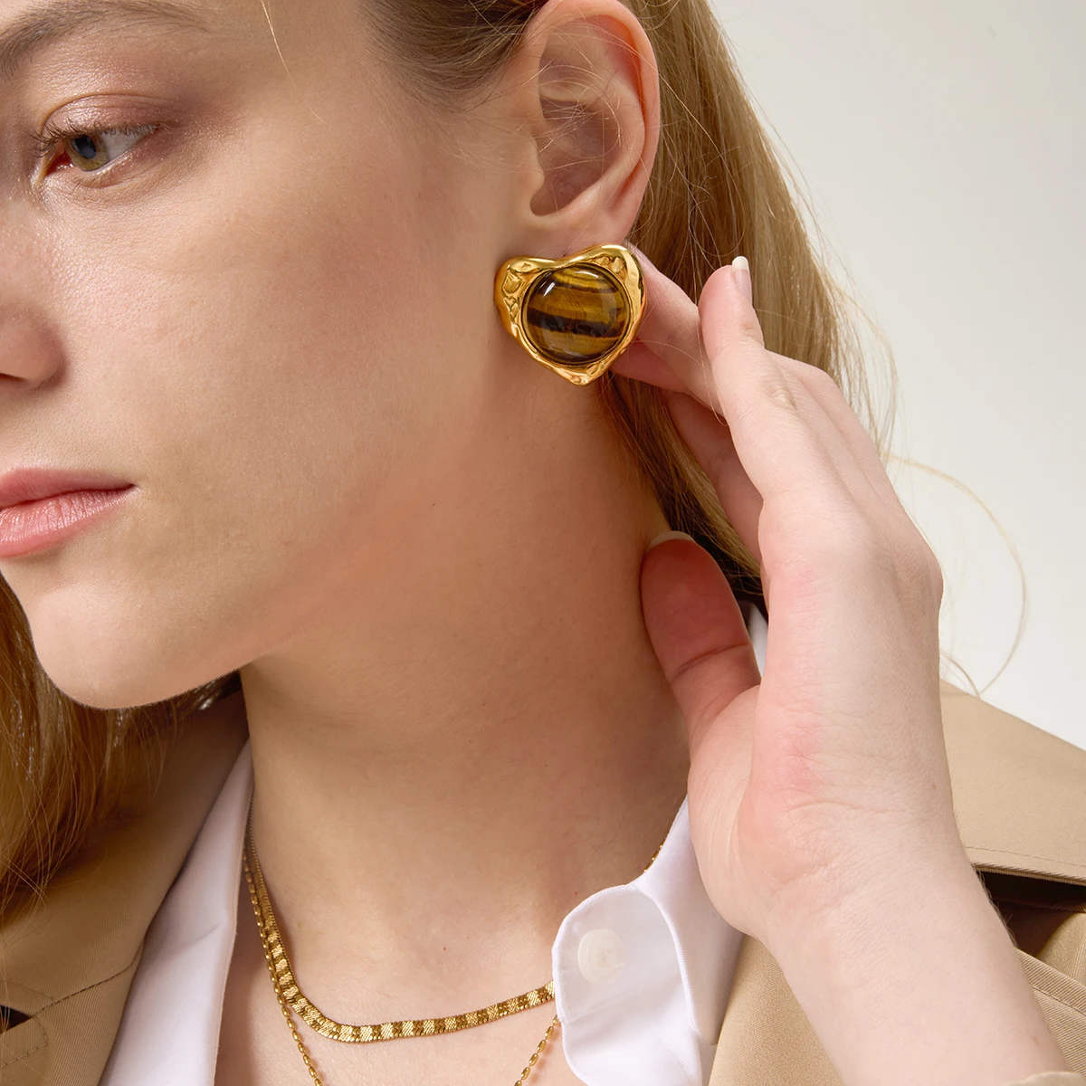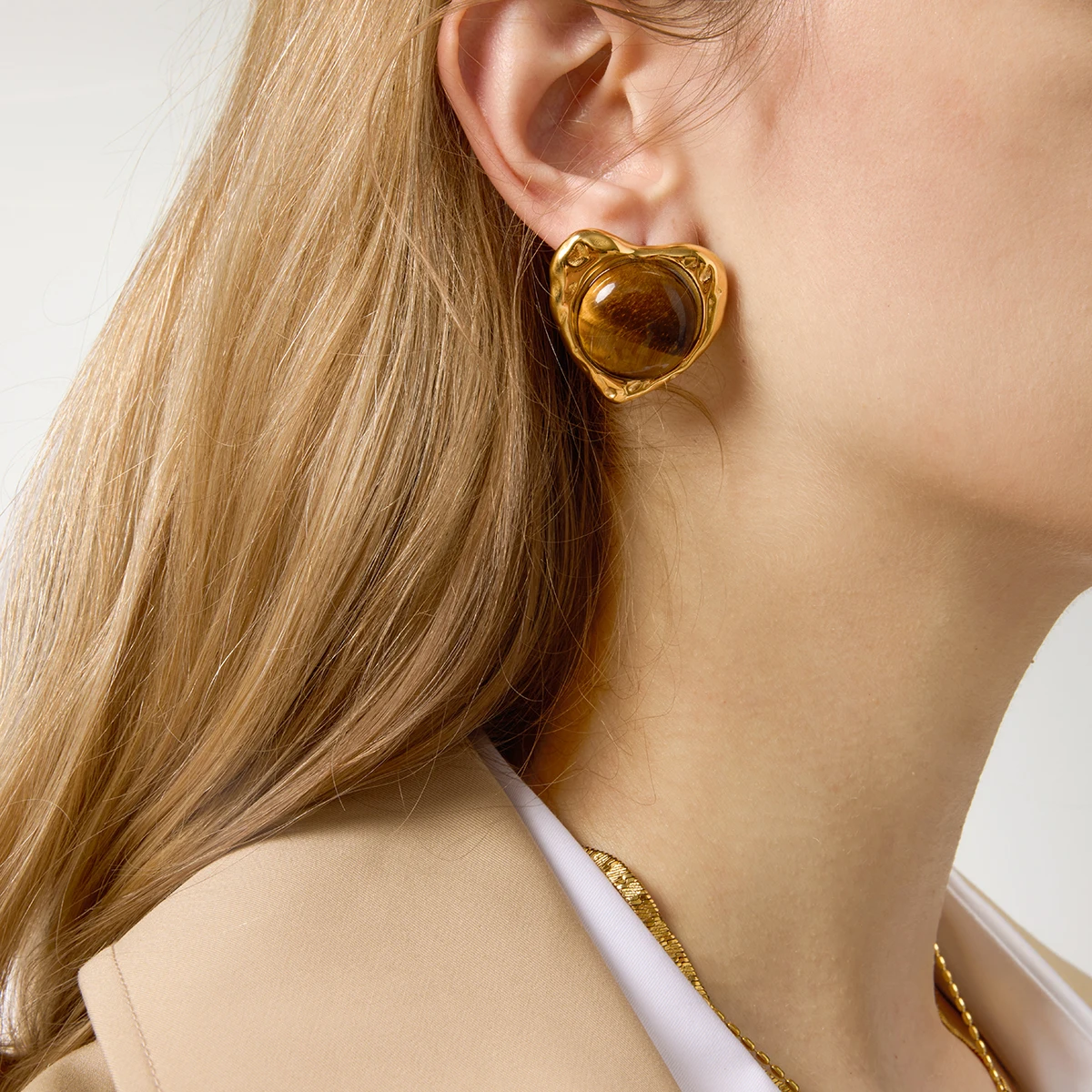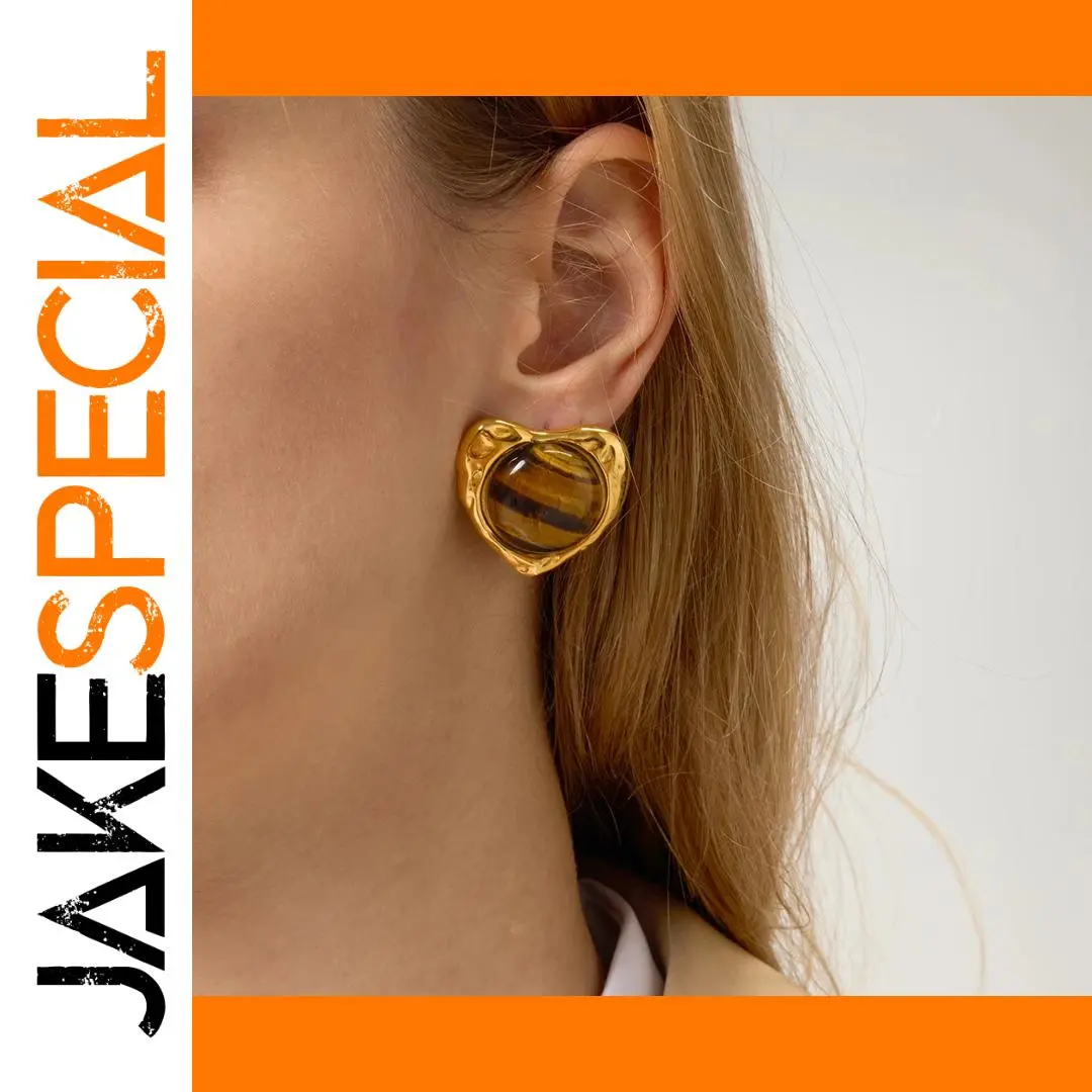 Enhance your jewelry collection with these vintage-inspired tiger eye stone heart earrings, crafted from high-quality stainless steel with a platinum finish and gold color accents. Featuring a round shape with a textured, handcrafted border, these stud earrings are secured with a screw-back fastening for reliable wear. The central polished tiger eye stone displays rich, warm brown hues with natural amber, dark brown, and gold banding, adding a sophisticated glow. Designed for women, these earrings combine timeless elegance with artisanal craftsmanship. Model number JDE0109036, with optional metal color variation JDN0109024, they promise durability, quality, and a warm, vintage charm that complements any style.