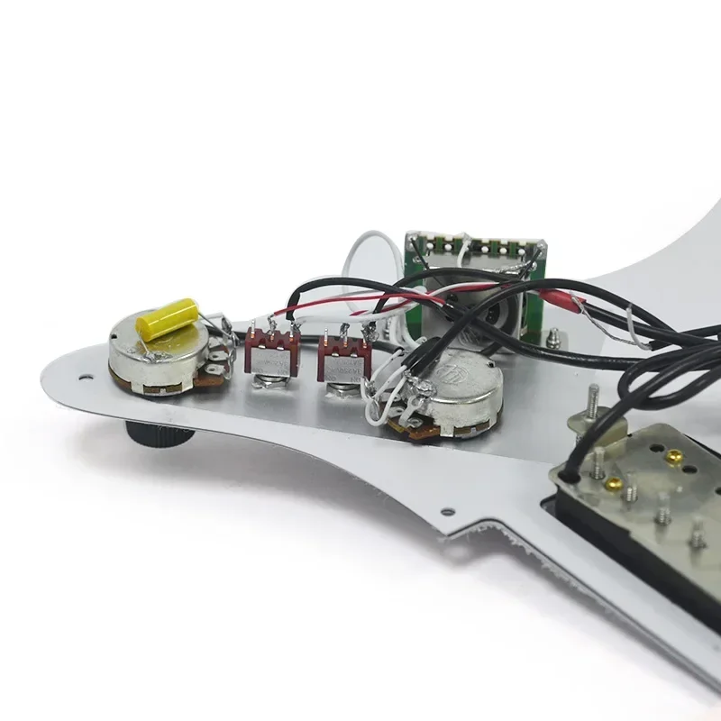 - Electrical setup includes two 500KΩ tone pots, one 500KΩ volume pot, a 3-way switch, and two on/on coil splitting switches. Also includes a durable 473J 400V capacitor for tone control.