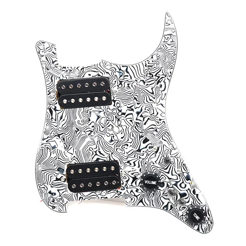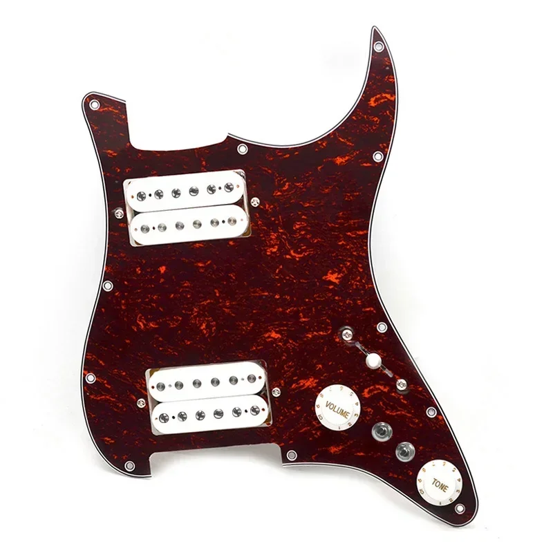 Experience a vintage-inspired upgrade with this high-quality, prewired HH pickguard. Its striking tortoiseshell/marbled red and brown finish instantly enhances your guitar's visual appeal, blending classic style with modern functionality. Designed with an asymmetrical, organic shape, the glossy surface adds a refined touch to your instrument, while the black humbucker pickups with chrome pole pieces create a sleek contrast. Equipped with sophisticated wiring and switching options, this pickguard allows you to easily split coils for versatile tones. Whether you're on stage or in the studio, this set offers durability, style, and tone-shaping capabilities that will elevate your playing experience.