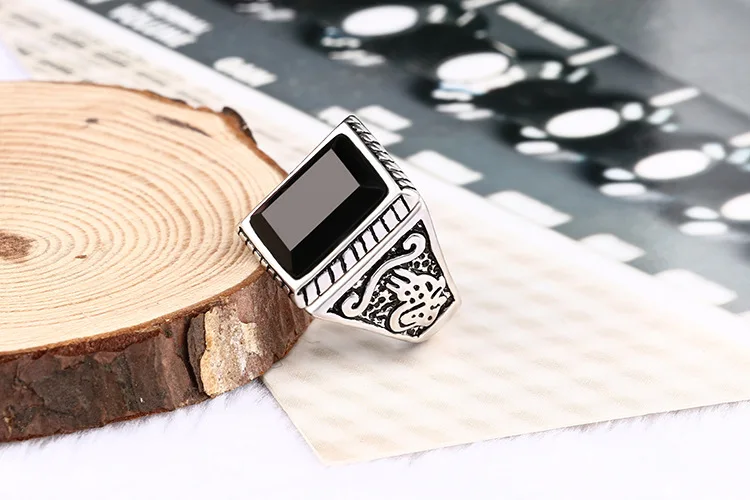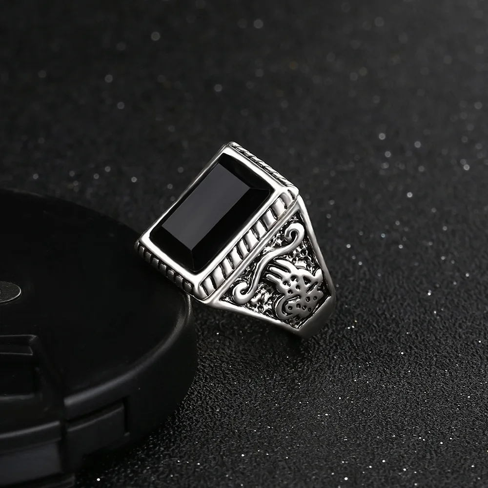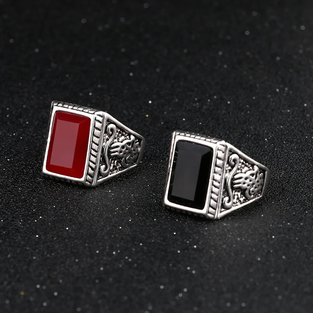 - The large rectangular cabochon stone, available in deep red or black, is bezel-set with a polished metal border, creating a striking focal point.