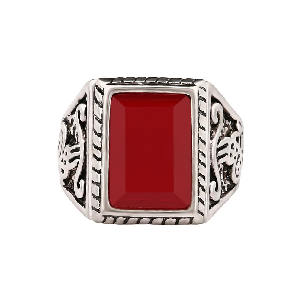 Experience the charm of this unisex fashion ring, crafted to make a statement with its vintage and bohemian appeal. Featuring a broad 11mm surface width, the ring showcases a large, rectangular cabochon gemstone that captivates with its deep red color, surrounded by a textured bezel setting. The side filigree-like detailing, adorned with swirling, floral, and scroll motifs, adds an intricate and ornate touch, blending geometric and floral patterns seamlessly. Made from durable zinc alloy with rhodium plating, the shiny silver finish enhances its elegant look. Because of its adjustable size (7 to 12), it comfortably fits various finger sizes. Perfect for special occasions or casual wear, this bold accessory elevates any style with its vintage, artistic flair.