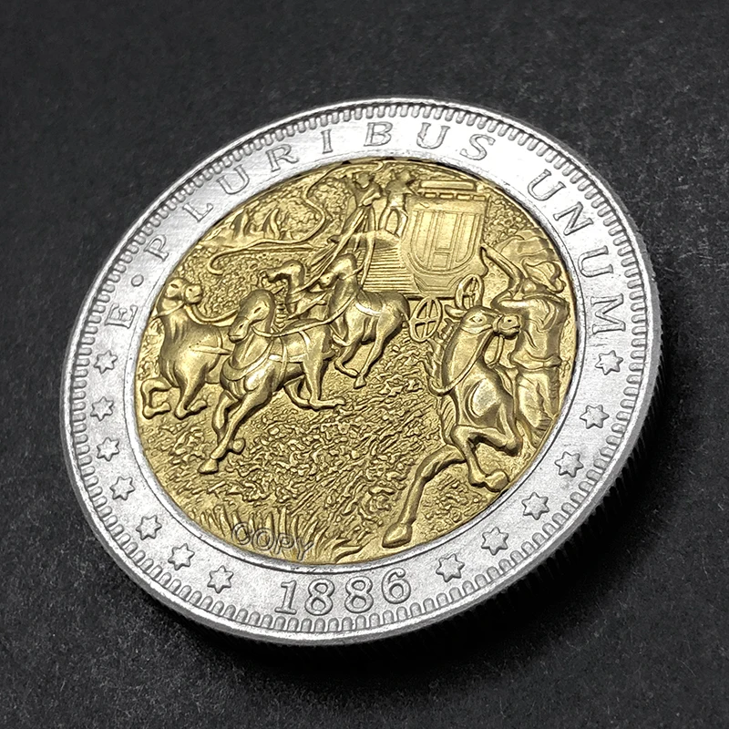 Imagine owning this stunning collectible that celebrates American heritage with intricate artistry. Measuring 38mm in diameter, this copper medal features a captivating two-tone design with a luminous gold-colored central scene of three horses and riders in dynamic motion. The background showcases textured trees and foliage, enhancing its vintage charm. Above, engraved motifs like a carriage and the year “1886” add historical depth. The silver outer ring bears the inscription “E PLURIBUS UNUM” and is decorated with small, evenly spaced stars, emphasizing patriotic symbolism. The medallion’s ridged edge frames the detailed design perfectly, making it a distinctive piece for display or collection. Its vintage craftsmanship evokes nostalgia and pride, ideal for enthusiasts of American history and heritage.