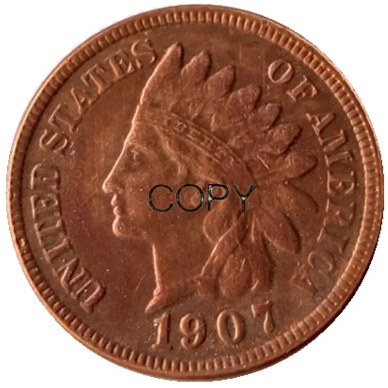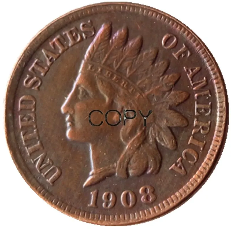 Step into history with this meticulously crafted replica of the US Indian Head Cents from 1907 to 1909. Each coin is made of 100% copper, showcasing a warm, vintage hue and a metallic finish that highlights detailed engravings and a weathered, aged patina. The design features a realistic, left-facing Native American profile with a textured feathered headdress, detailed facial features, and classic inscriptions reading “UNITED STATES OF AMERICA” and the respective year—1907, 1908, 1908S, 1909, or 1909S. These coins evoke a strong patriotic and nostalgic appeal, perfect for collectors or as decorative accents with a timeless, retro style. Their rich historic aesthetic is both durable and visually captivating, adding a unique touch to any collection or display.