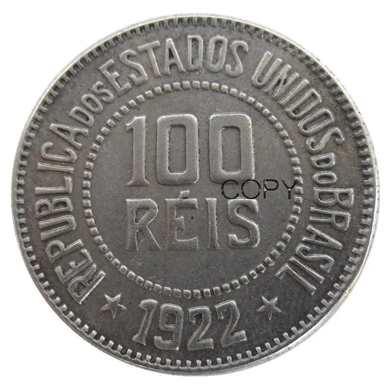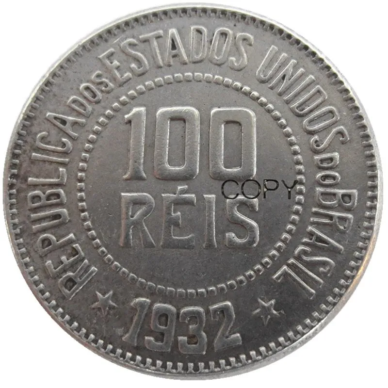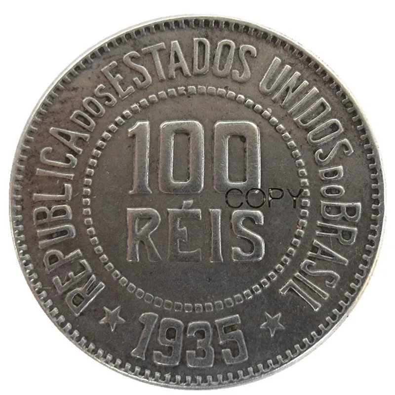 - The reverse sides display the denomination “100 REIS” with curved “REPUBLICA DOS ESTADOS UNIDOS BRASILEIRO” text, along with the year inscribed at the bottom—either 1922, 1932, or 1935.