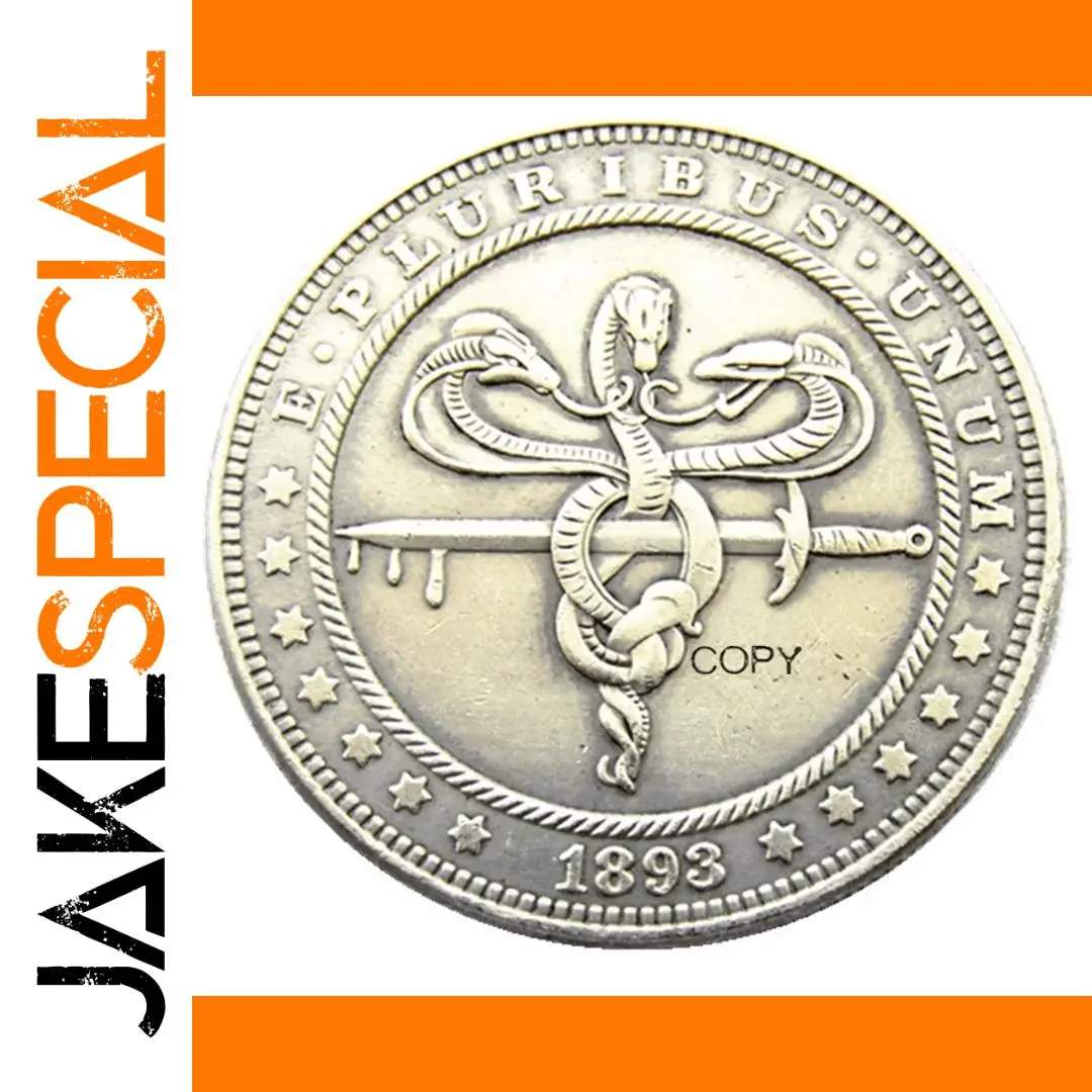 This high-quality reproduction coin captures the timeless charm of 19th-century American coinage, blending patriotism with nostalgic design. Crafted from metal with a classic silver finish, it showcases intricate detailing reminiscent of vintage currency. The central motif features a fierce snake coiled around a staff, symbolizing strength and resilience, with the word “COPY” inscribed to denote its reproduction nature. The date “1893” and the phrase “E PLURIBUS UNUM” along with evenly spaced stars enhance its authentic, old-world aesthetic. Its aged surface and refined rim design lend a nostalgic, antique feel perfect for collectors or patriotic decor enthusiasts. This coin is a stunning addition to any vintage-themed collection or display.