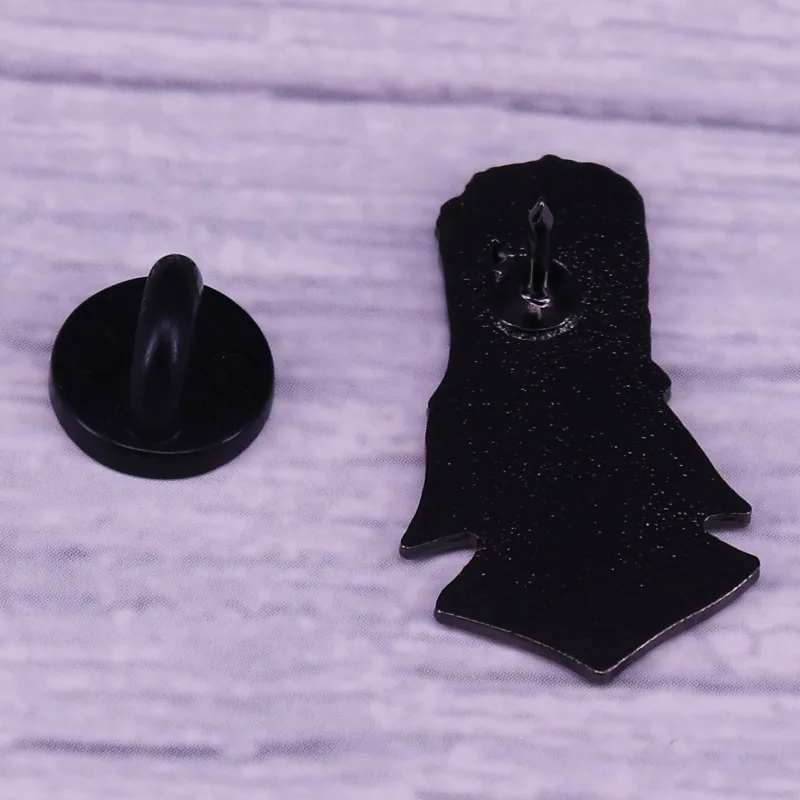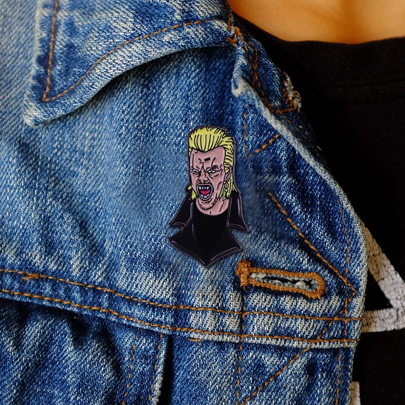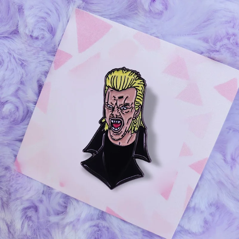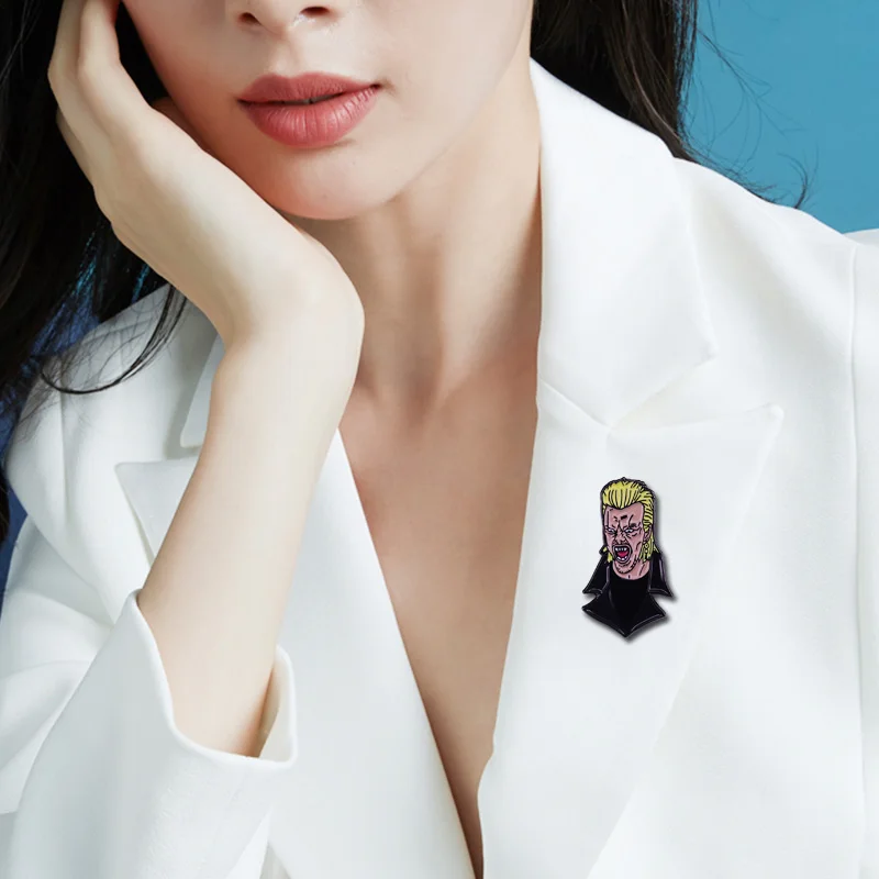 Capture the nostalgic charm of 80s horror with this unisex copper lapel pin, approximately 30 mm in size. Crafted with classic metal detailing, it features a vibrant figure-shaped design of a vampire character, inspired by retro comedy horror movies. The pin’s bold, comic-style artwork showcases exaggerated facial features, slicked-back platinum hair, and a dramatic black cape with a high collar, all highlighted by shiny black outlines. Its irregular shape and vivid colors make it a standout accessory for collectors and horror enthusiasts alike, perfect for adding a touch of vintage horror flair to your lapel, bag, or collection.