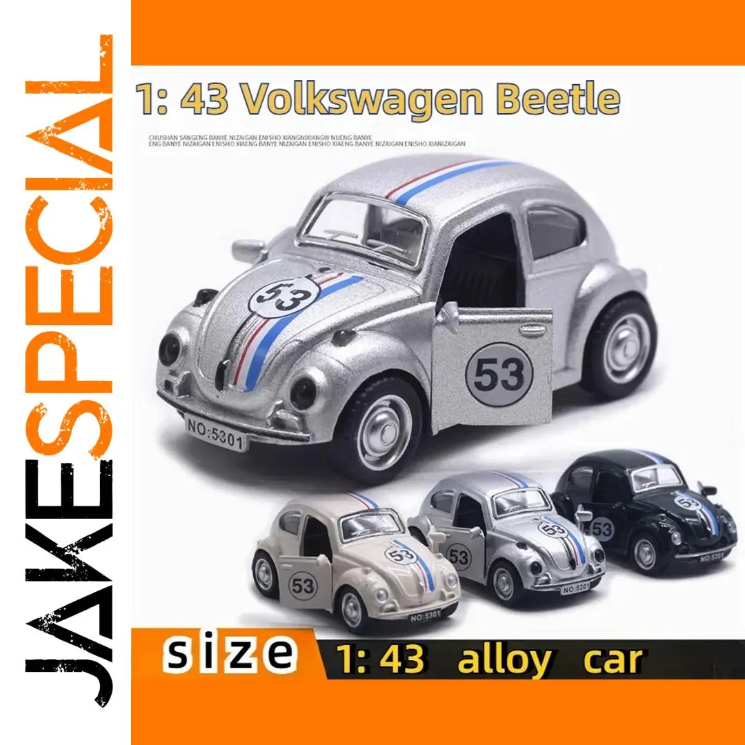 Experience the charm of this beautifully crafted diecast alloy model of the Volkswagen Beetle, designed in a pristine 1:43 scale. Featuring a realistic rounded shape, it captures the vintage essence with sleek metallic finishes, including silver, blackish green, and white options. The model showcases detailed features such as black-tinted windows, headlights, silver side mirrors, and well-crafted wheels with silver hubcaps. The openable doors add an interactive aspect, perfect for display or cake decoration. Its nostalgic yet sporty design, highlighted by a white racing stripe with red and blue accents and the number “53,” makes this model an eye-catching collectible. Elevate your collection or special event with this authentic and charming miniature.