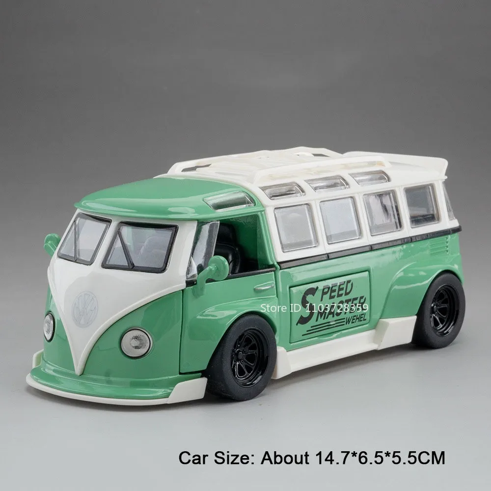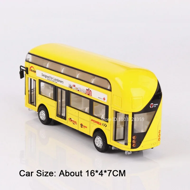 This 1:32 scale diecast model features a durable metal body, plastic chassis, and rubber tires, capturing vintage charm with intricate details. The vehicle measures approximately 14.7 x 6.5 x 5.5 cm, available in vibrant colors such as yellow, green, blue, and black, while the double-decker version measures about 16 x 4 x 7 cm in blue, pink, red, or yellow. It offers realistic opening doors, engine hood, and trunk, along with sound and light functions activated by pressing. The pull-back mechanism allows smooth forward motion, making it an engaging collectible or display piece for enthusiasts seeking high-quality craftsmanship and nostalgic appeal.