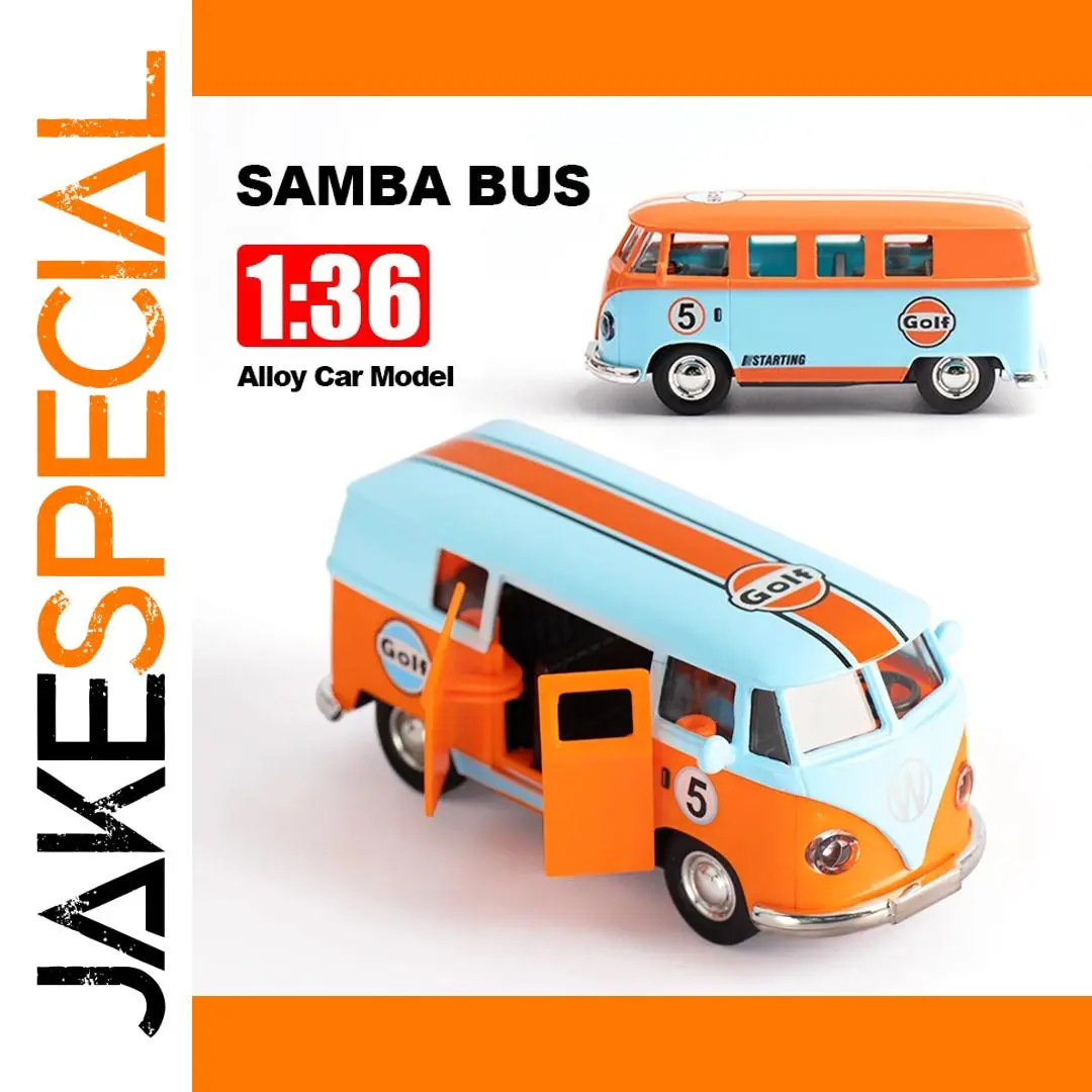 Imagine owning this vibrant 1/36 scale diecast model of the Volkswagen T1 Samba bus, perfectly capturing its nostalgic charm and playful personality. With a bright sky blue body complemented by bold orange stripes along the roof and sides, this model exudes lively character. Its smooth, rounded design pays homage to the classic T1, enhanced by a glossy finish and intricate details like chrome hubcaps, clear plastic windows, and carefully applied decals such as the white “Golf” logo and numbered circles. Measuring 14.3 centimeters long and 5 centimeters wide, this collectible offers functional features like an opening side door, a self-propelled rear wheel, and sound and light effects, making it an engaging addition for enthusiasts and collectors.