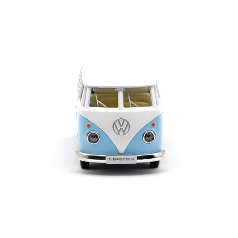 Capture a vintage charm with this highly detailed 1/36 scale diecast T1 bus model, crafted from alloy and plastic. Its pastel blue body with crisp white accents, rounded contours, chrome bumper, and silver hubcaps create an authentic retro aesthetic perfect for display or gifting. Large curved windshield with transparent windows reveals an intricately detailed beige interior, while subtle features like side mirrors and turn signals enhance realism. This static collectible measures approximately as per manual measurements, with potential deviations, and is ideal for adult enthusiasts seeking a high-quality replica to add to their vintage transport memorabilia collection.