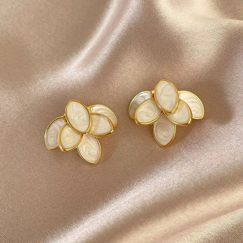 Experience the timeless elegance of these vintage-inspired white enamel drip stud earrings. Designed with delicate, irregular petal shapes, they evoke a romantic and antique charm. Constructed from durable zinc alloy with a luxurious KC golden finish, these earrings showcase a refined floral motif that complements both casual and formal outfits. Their intricate design features high-quality white enamel petals outlined with gold-colored metal, creating a sophisticated contrast. Each earring has a classic push-back closure, ensuring secure and comfortable wear. Perfect for women who appreciate unique, vintage-style jewelry with enduring quality, these earrings add a touch of delicate femininity to any look. Fully crafted without harmful chemicals, they emphasize style and safety.