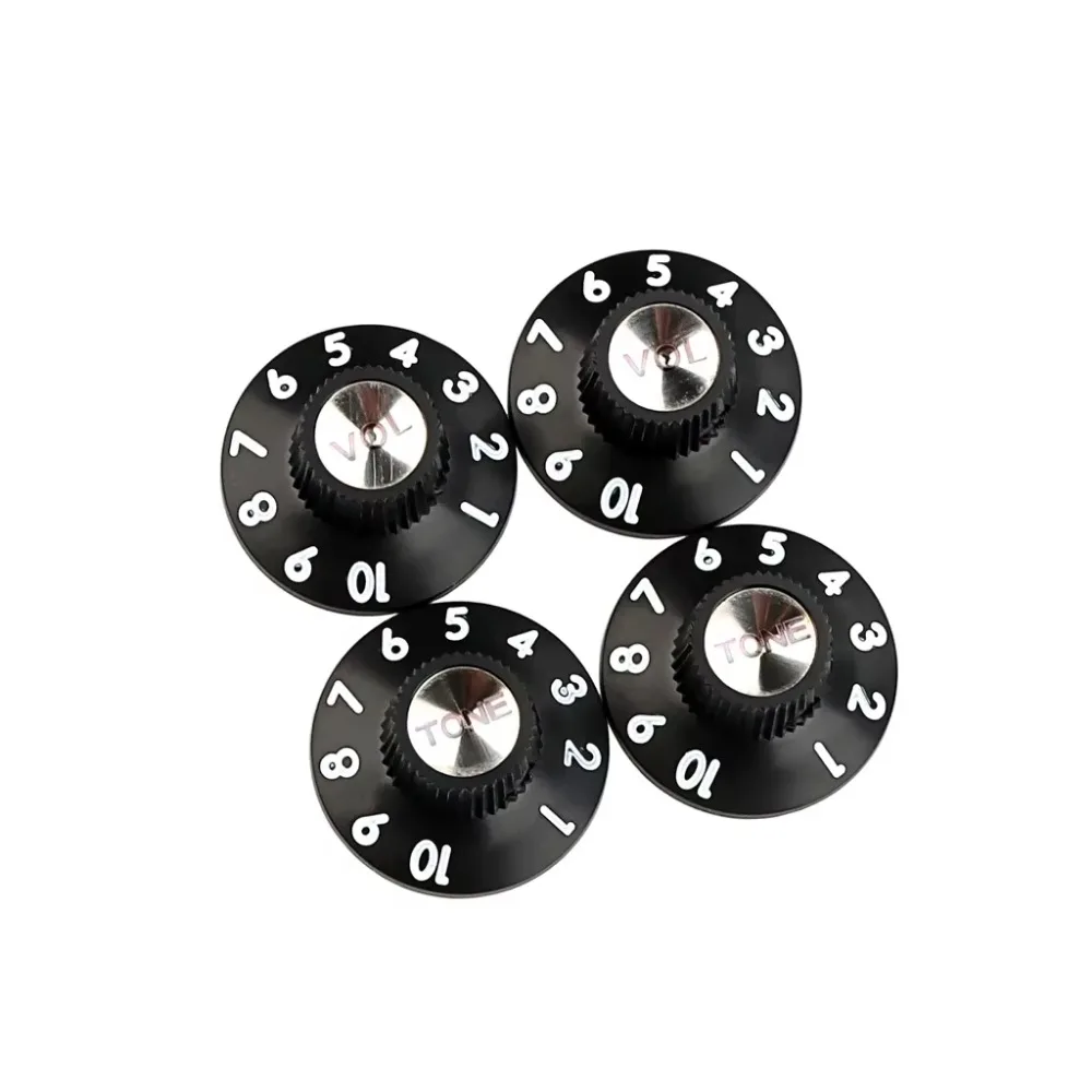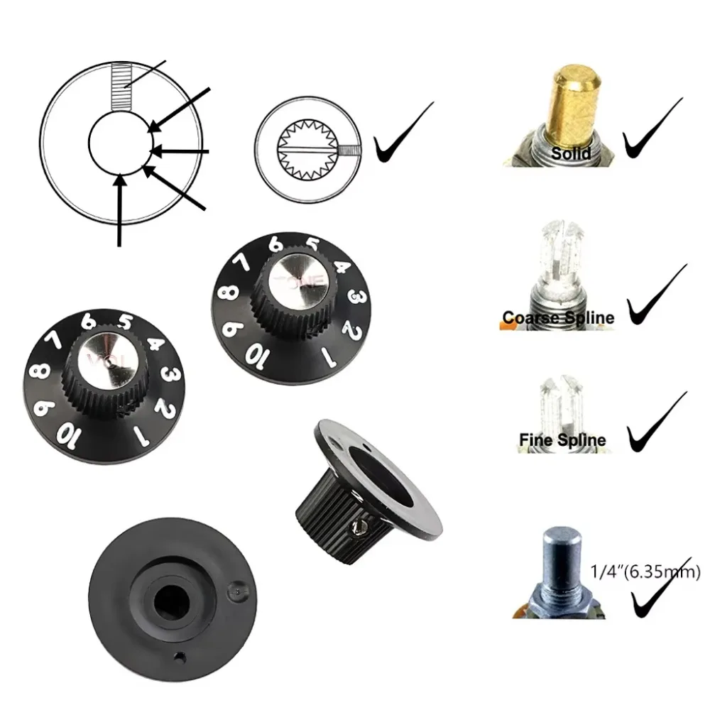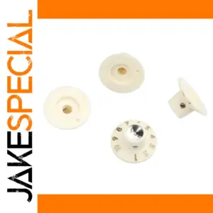 Enhance your musical gear with this set of vintage-inspired control knobs crafted from durable ABS plastic, featuring metallic aluminum and silver reflectors for a classic look. Measuring 15.7mm in height with a 30mm base diameter and 6.5mm inner hole diameter, these knobs are designed to fit 1/4″ solid shaft potentiometers. Available in sleek black and aged white finishes, each knob includes a metal set screw for secure attachment. Ideal for electric guitars, bass guitars, amplifiers, and effect pedals, they provide a stylish upgrade or replacement for worn or damaged controls, blending functional precision with retro aesthetic appeal.