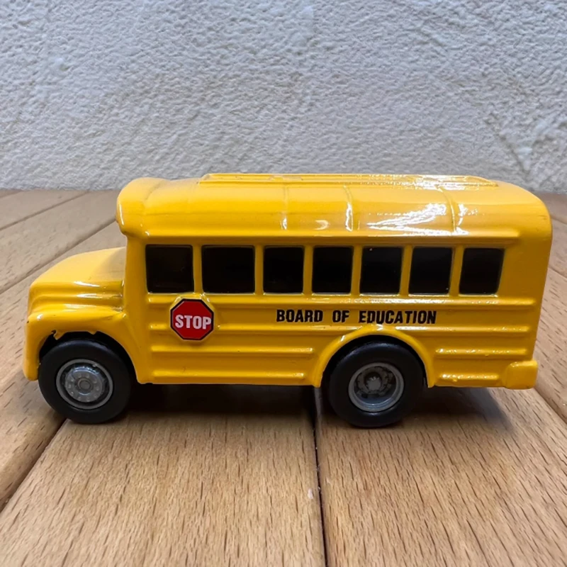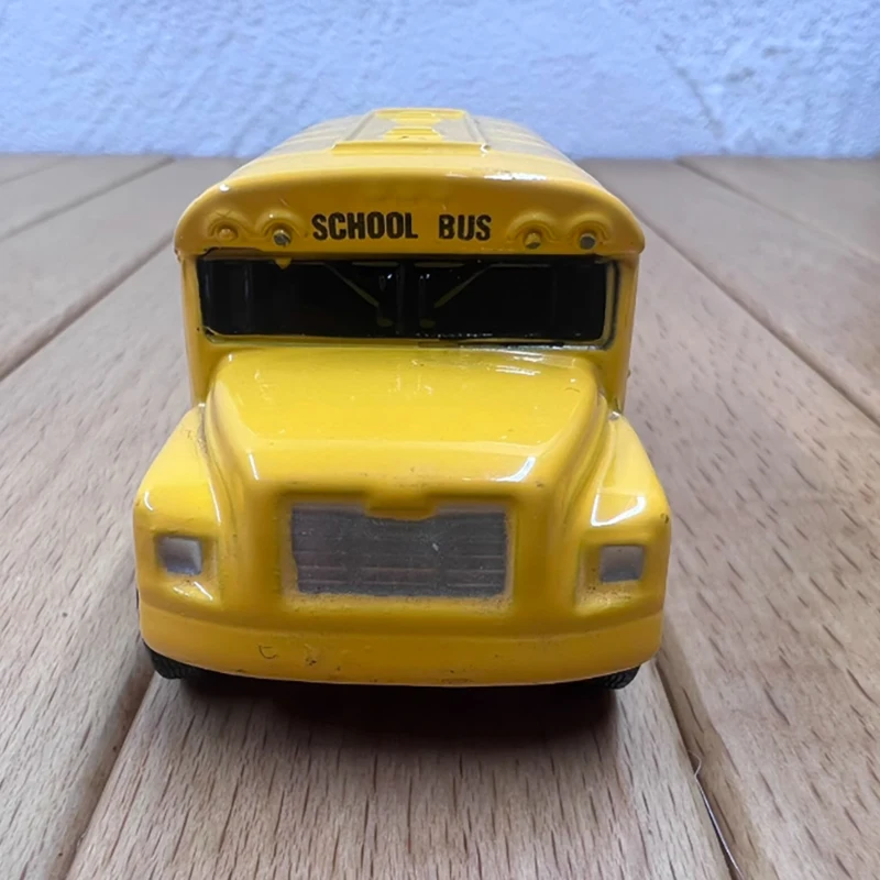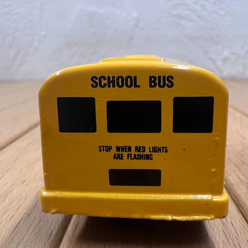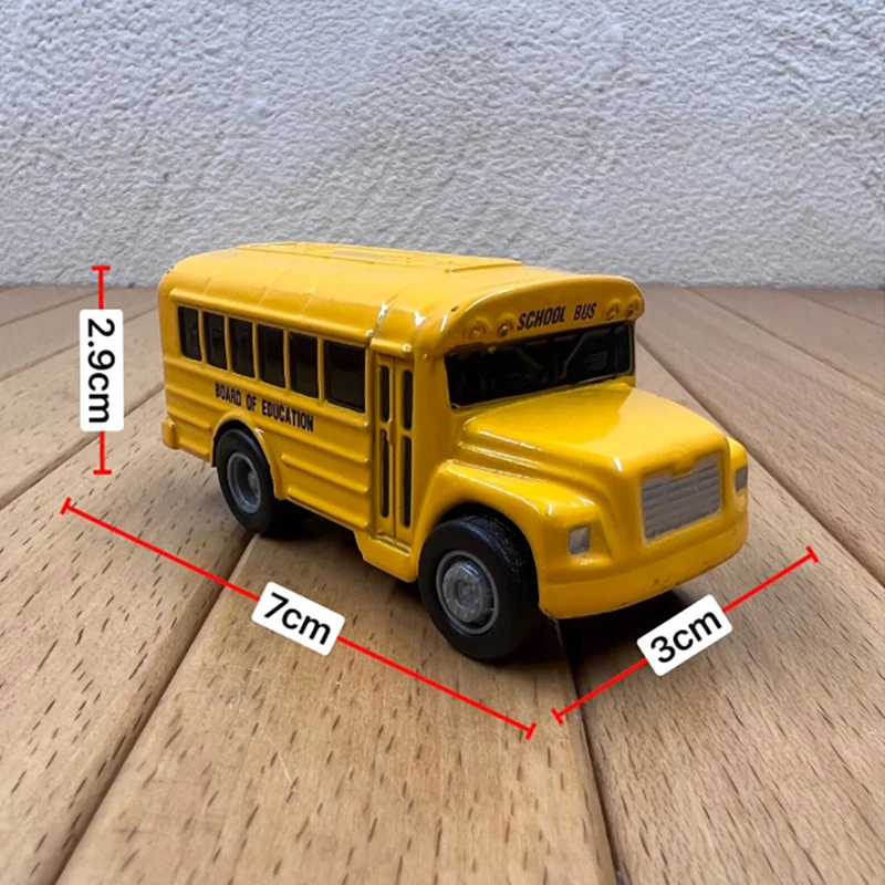 This diecast alloy model measures approximately 7 cm in length, 3 cm in width, and 2.9 cm in height, featuring a bright yellow, glossy finish with simple, stylized details including black-framed windows, a rounded ridged roof, and black wheels with silver hubcaps. Designed as a static collectible and display piece, it showcases visible scratches and paint flaws that add vintage charm. The model is non-electric, battery-free, and intended for collectors aged 14 and older, making it an ideal decorative or gift item, capturing a playful school bus aesthetic with a stylized, toy-like appearance.