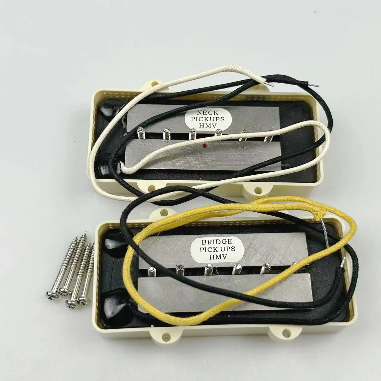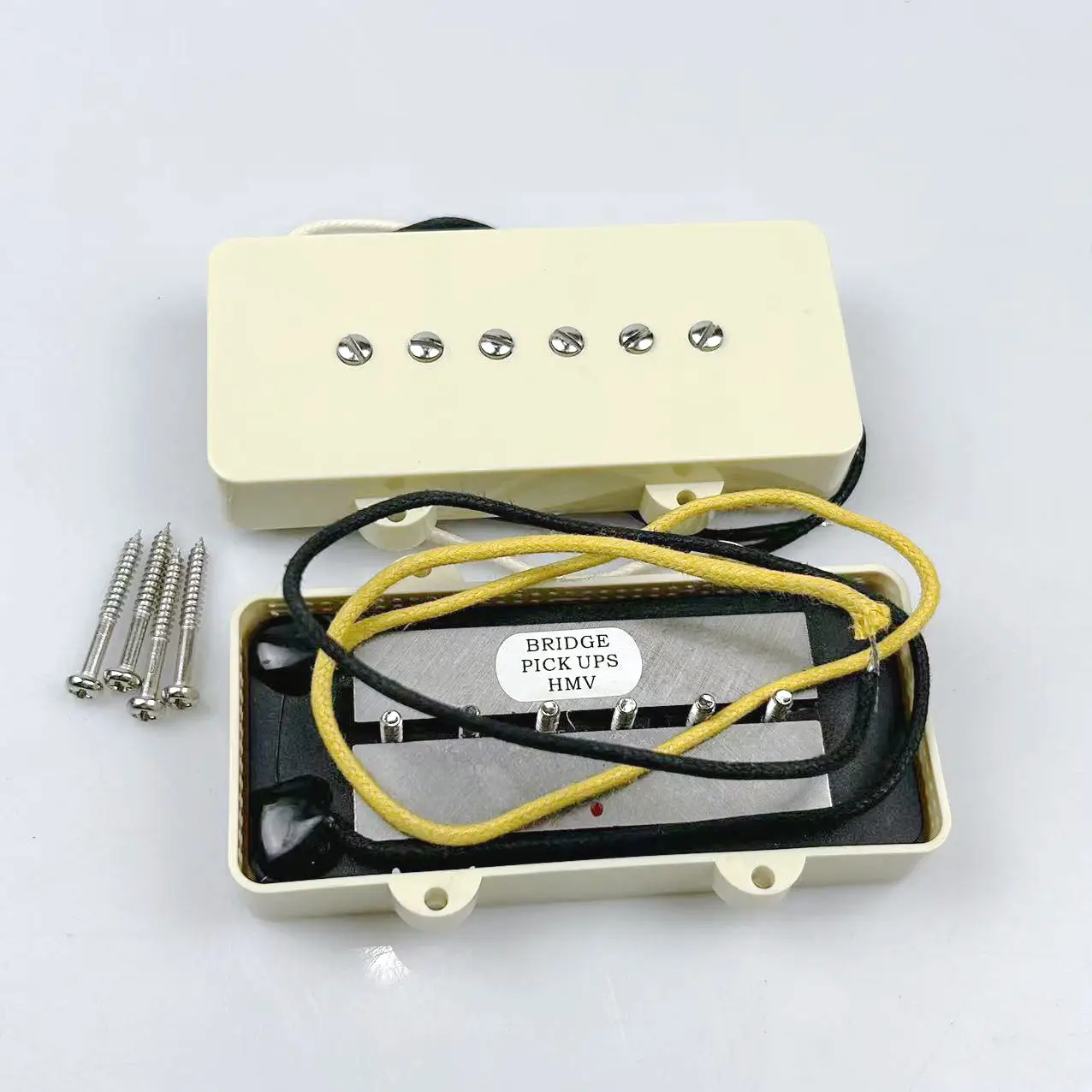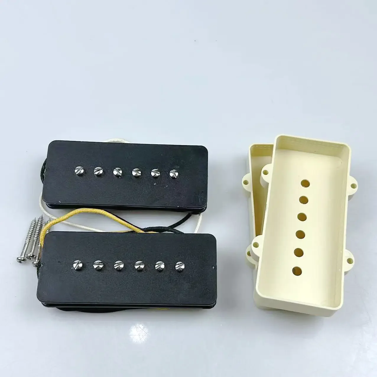 Enhance your jazzmaster-style guitar with this vintage-inspired set of passive single coil pickups featuring yellow plastic covers, adjustable pole pieces, and cloth-coated wiring. With an approximate resistance of 8.1KΩ for the neck and 8.8KΩ for the bridge, along with inductance values of 5.5H and 6.4H respectively, these pickups deliver a wider, more open sound characteristic of classic tones. Designed with a 52mm pole spacing for both positions and made from durable composite materials, their sleek rectangular, flat covers with rounded edges and six flat-head screws evoke a nostalgic aesthetic. Easy to install, they are perfect for achieving authentic vintage style on your jazzmaster electric guitar.