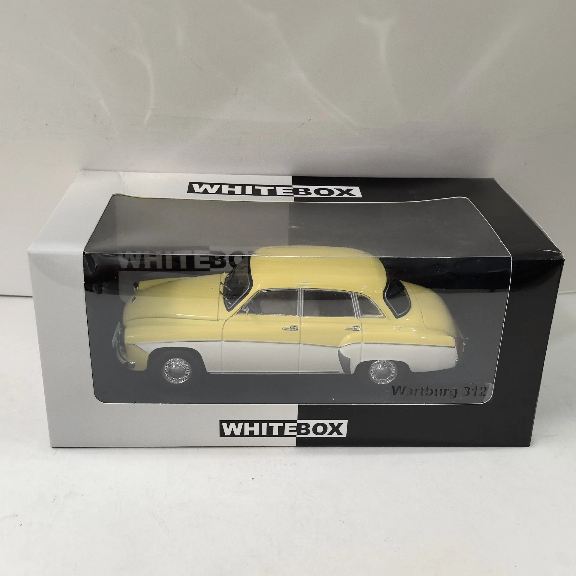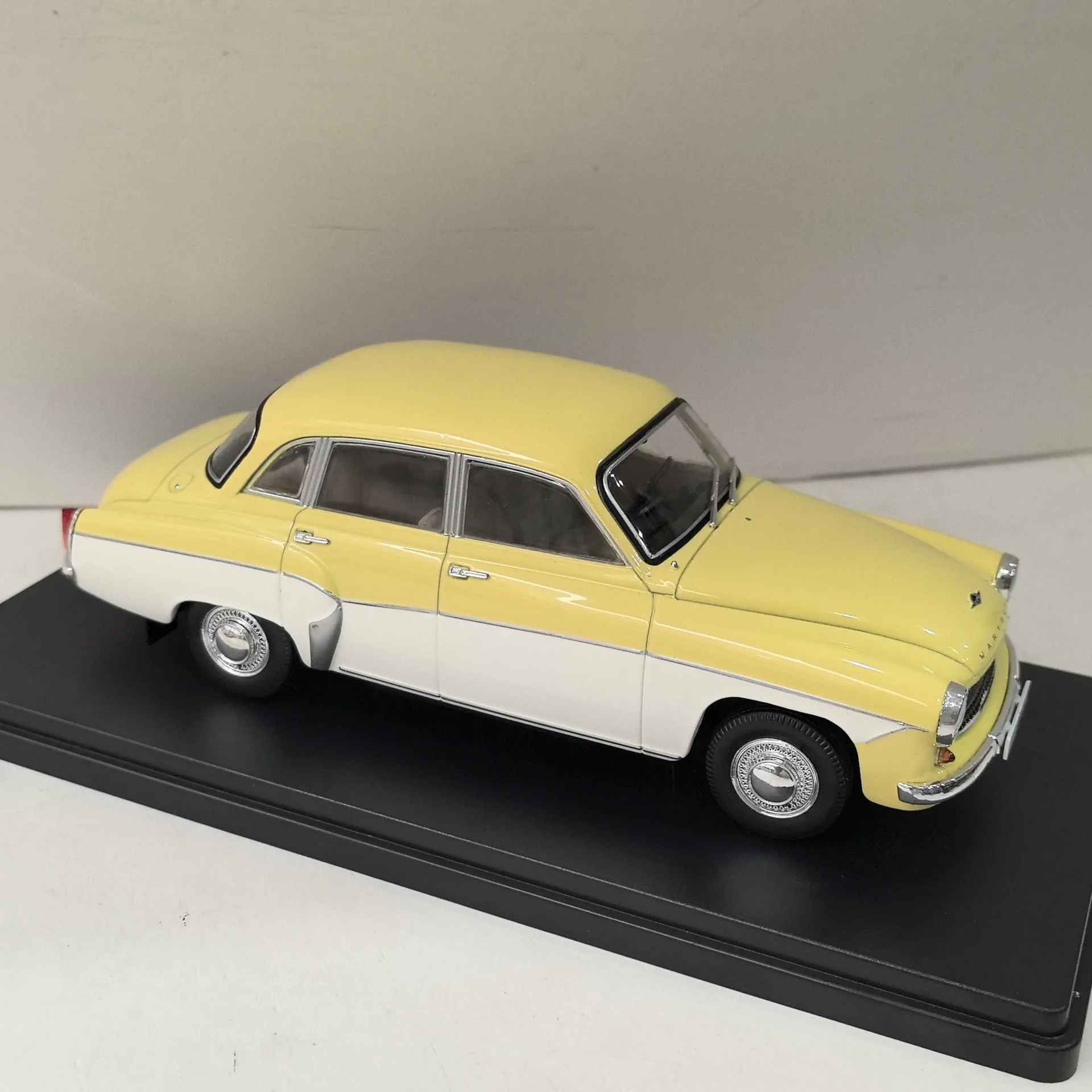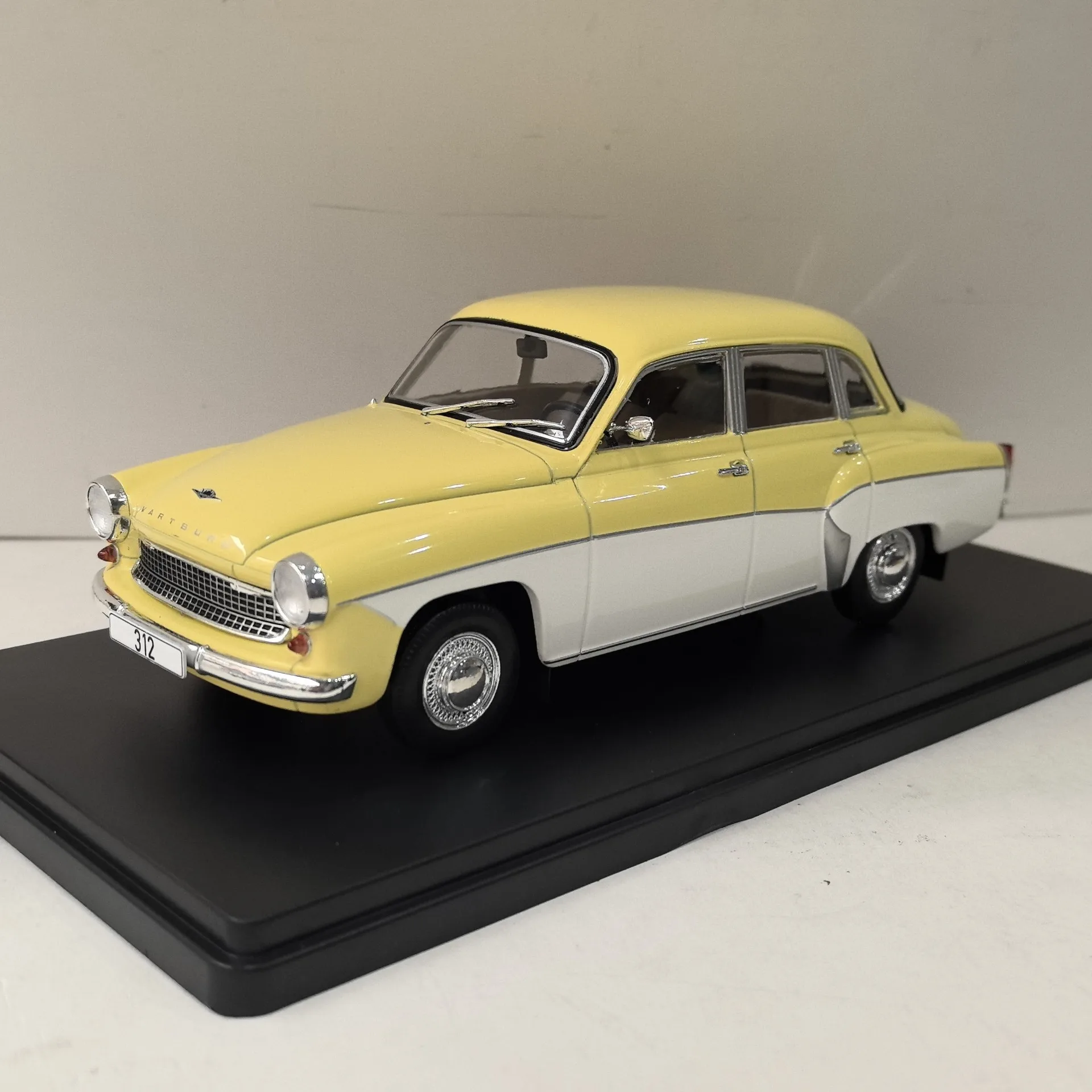 The 1:24 scale diecast model of the Wartburg 312 classic car offers a detailed vintage design, crafted from zinc alloy with plastic and rubber components. It features rotatable wheels, a smooth metallic finish, and a vibrant yellow body with a contrasting white lower section, capturing the mid-20th-century style. The rounded silhouette, black-outlined windows, chrome accents on headlights and grille, and realistic rubber tires give this collectible a true-to-life appearance. Although doors are non-functional and it is not electric, this model is perfect for display, gifts, or home decoration for enthusiasts aged 14 and above. Small paint imperfections on the top add authentic charm.