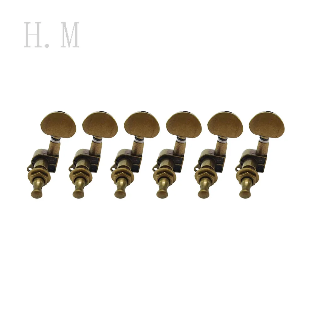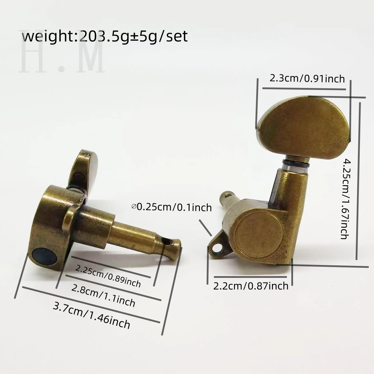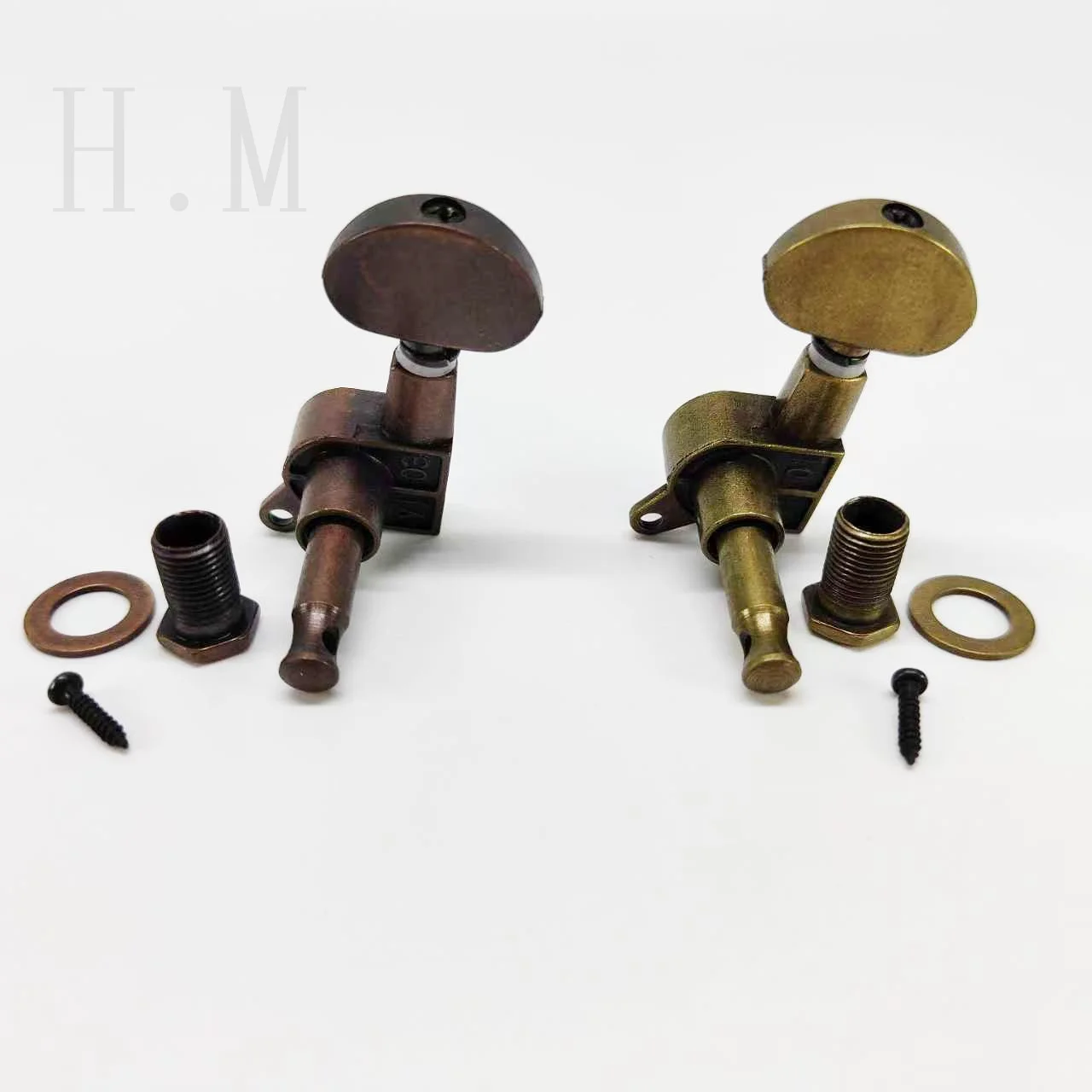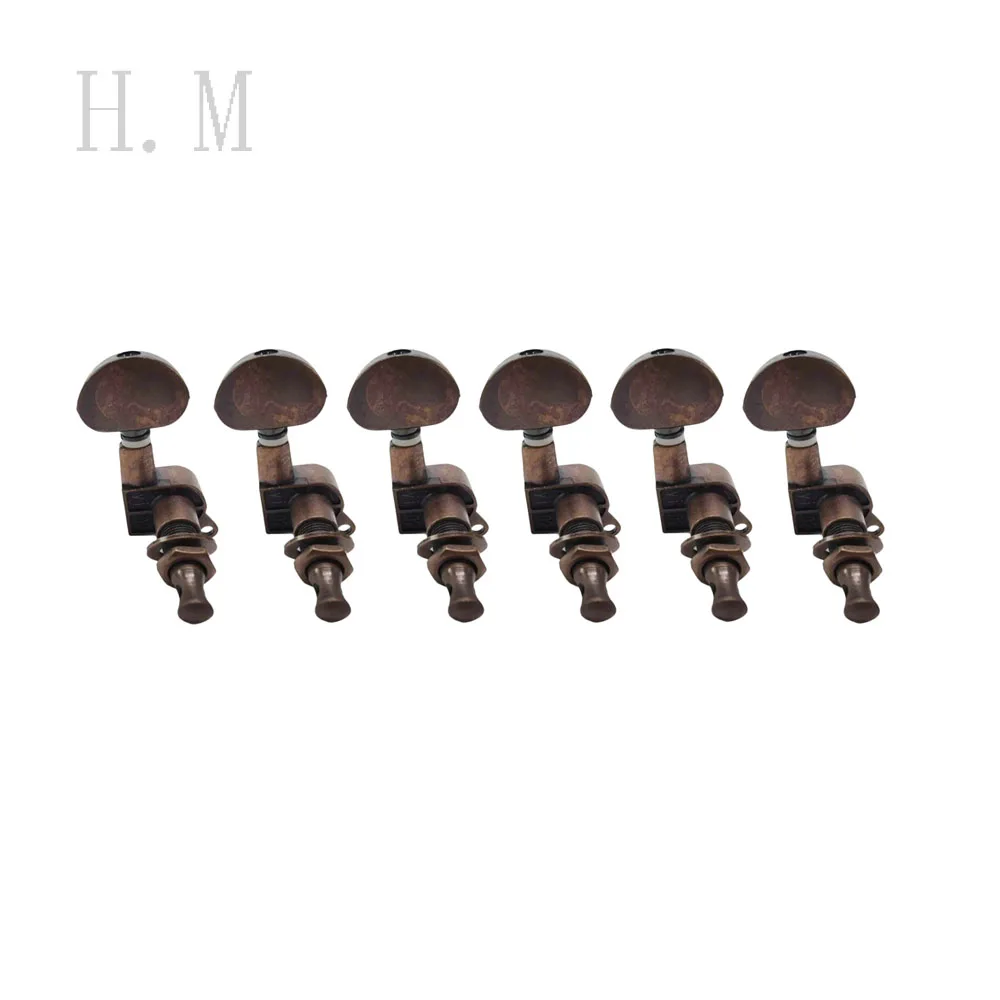 Enhance your guitar with this vintage-style set of six fully enclosed tuning pegs crafted from durable zinc alloy, weighing approximately 203.5 grams ± 5 grams per set. Available in striking red antique bronze and green antique bronze finishes, these tuners feature large semicircular string buttons with smooth, rounded shapes, suitable for both right-handed and left-handed configurations (3R, 3L, 6R, 6L). The set includes six tuning knobs, washers, nuts, and screws, all designed for long-lasting performance on metal guitar strings. Perfect for restoring or customizing your instrument with a rugged, nostalgic aesthetic.