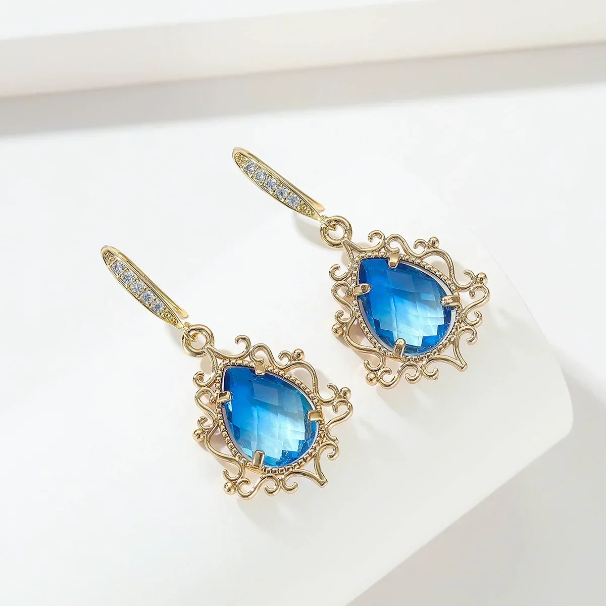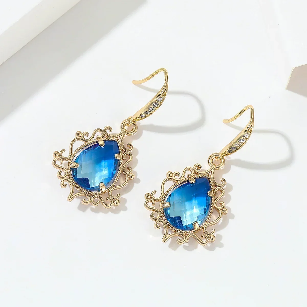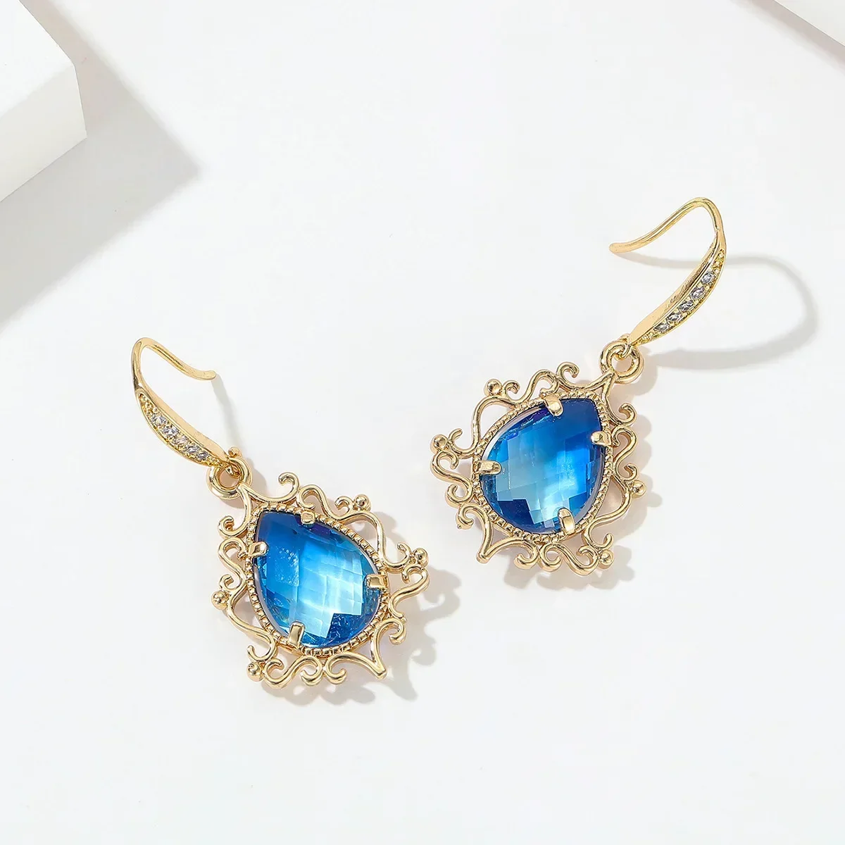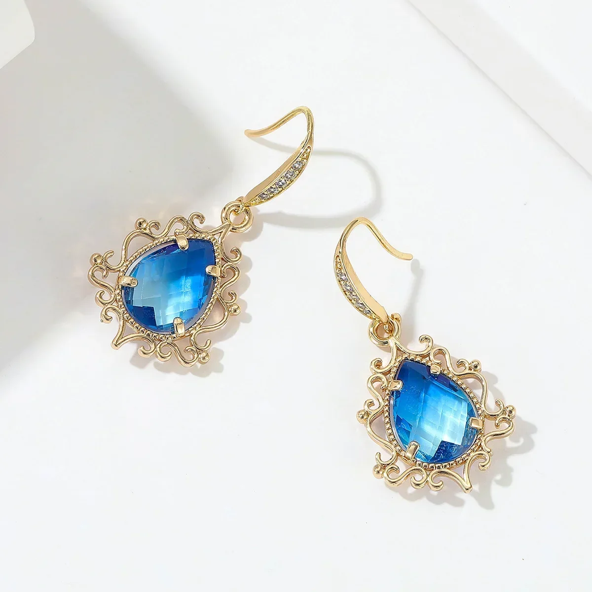 Feel crafted for elegance and timeless beauty, these vintage-inspired drop earrings feature a stunning combination of vibrant blue crystals and warm, polished gold-colored metal. The intricate design showcases delicate scrolling filigree patterns with symmetrical curls, enhancing their romantic, antique charm. Each earring softly drapes a large, faceted blue crystal that catches the light from multiple angles, creating a captivating sparkle. The slender, curved hooks are embedded with tiny zircon blue crystals, adding a shimmering edge to the overall look. Weighing about 7 grams, they offer a comfortable fit without sacrificing visual impact. Whether worn for special occasions or as a refined everyday accessory, these earrings are designed to elevate any style with their exquisite detailing and vibrant hues.